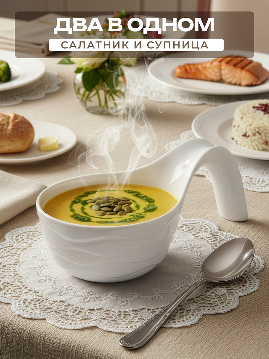 Салатник-супница от Elan Gallery "Айсберг волны" размером 23,5х15х9,5 см выполнен из белого фарфора. Имеет удобную ручку. Объём ёмкости – 600 мл. Глубокая суповая тарелочка украшена рельефными узорами в виде волн. Круглую тарелку можно использовать как супницу, салатник или сервировочное блюдо. Она станет незаменимым предметом для сервировки каши на завтрак, а в обед подойдёт для супа, бульона или окрошки. Благодаря глубокой форме блюдо станет незаменимым помощником для подачи плова или гарниров: гречки и риса с овощами. За счёт высоких стеночек салатница удобна для смешивания ингредиентов или заваривания лапши. Возьмите её на дачу, чтобы приспособить как фарфоровую миску для ягод или вазочку для конфет. Используйте за просмотром любимых фильмов как мисочку под закуски, например, снеки и чипсы. В отличие от керамики фарфор не впитывает цвет и запах продуктов. Готовьте салат из таких овощей, как свекла и морковь, фарфоровая поверхность чаши легко отмывается. Не рекомендуется применять абразивные моющие средства. Можно использовать в микроволновой печи и мыть в посудомоечной машине. Подходит в роли формы для запекания в духовке при температуре до 230 градусов. Бульонница поставляется в стильной картонной коробке. Эта тарелка станет отличным подарком на праздник для тех, кто ценит стильную сервировку. Благодаря красочной коробочке не понадобится дополнительная подарочная упаковка. В коллекции бренда Элан Галерея представлено много товаров для дома и красивого кухонного инвентаря. Здесь можно найти сервировочные блюда и конфетницы на любой вкус!