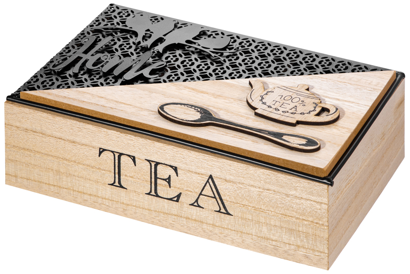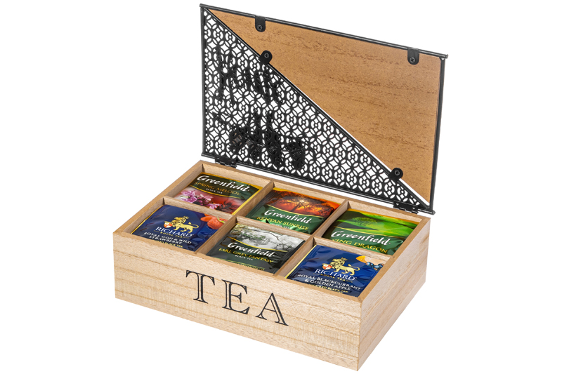 Органайзер для чайных пакетиков от Elan Gallery – это удобное решение для любителей чая. Имеет 6 секций внутри. Размер коробочки – 24х16х8,5 см, размер каждого отделения – 7,5х7х6,5 см. Высота без крышки 7 см. Контейнер с отсеками изготовлен из МДФ, имеет элементы из металла. Выполнен в стильном дизайне в виде сундучка с множеством декоративных элементов на крышке. Украшен надписями "100% tea" ("100% чая"), "Home" ("Дом") и "Tea" ("Чай"). Откидная крышечка защищает чайные пакеты от пыли и других внешних факторов. Ёмкость можно использовать для хранения капсул для кофемашины, пакетиков с растворимым кофе, фильтр-пакетов с травами. Эта стильная и функциональная подставка украсит интерьер кухни или столовой. Чайная шкатулка станет чудесным подарком для ваших близких на любой праздник. Нельзя использовать абразивные моющие средства. Нельзя замачивать и использовать в посудомоечной машине. Сделайте оригинальный подарок себе или близким – маленький ящик для чайных пакетиков украсит вашу кухню и поможет хранить всё необходимое в одном месте. В коллекции бренда Элан Галерея представлено много стильных товаров для дома, выберите вариант на свой вкус!