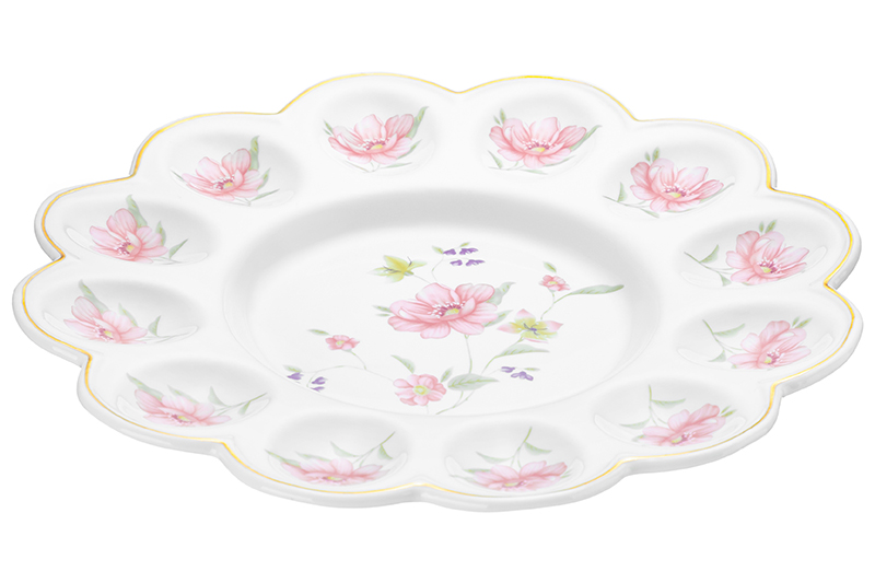 Тарелка для фаршированных яиц из серии «Диана» предназначена для эстетичной сервировки вашего стола. Размер изделия – 24х24х2,5 см, диаметр центральной секции – 11 см. Выполнена из фарфора new bone china, сочетающего в себе изящность и высокую прочность. За счёт гладкости изделия легко отмываются, поэтому долго сохраняют привлекательный вид и практичны в использовании. Плотная структура материала позволяет посуде дольше сохранять температуру блюд и напитков. От других видов костяного фарфора new bone china отличается большей экологичностью в производстве. Тарелка украшена рисунком в виде нежных цветков и элегантной золотой окантовкой. Используйте блюдо для необычной подачи фаршированных яиц и других угощений. Наполните ячейки крашенными яйцами, подайте к столу для традиционного пасхального катания. В центральную ячейку отлично поместится кулич. Создайте композицию по своему вкусу, чтобы преобразить праздничный стол! Не рекомендуется применять абразивные моющие средства. Не подходит для использования в посудомоечной машине и микроволновой печи. Поставляется в стильной картонной коробке – благодаря ей вам не потребуется дополнительная подарочная упаковка. В коллекции бренда Elan Gallery вы найдёте большой выбор декоративной посуды и сувениров – каждый обязательно подберёт вариант на свой вкус. Изделия станут чудесным подарком для родных, близких и коллег. Наполните пространство вокруг себя уютом и эстетикой!