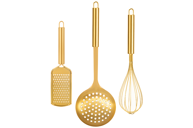 Набор 3 принадлежностей от Elan Gallery станет практичным дополнением вашего кухонного инвентаря. Включает в себя тёрку размером 24,5х5,9х2 см, венчик размером 29х6,5х6,5 см и шумовку размером 35х11,5х2 см. Выполнены из нержавеющей стали и имеют титановое покрытие. Оно не только придаёт им благородный золотистый цвет, но и повышает износостойкость и термостойкость, а также защищает от коррозии. Благодаря лаконичному дизайну приборы гармонично дополнят интерьер любого дома. Покрытие безопасно для контакта с пищевыми продуктами. Приспособления предназначены для самых разнообразных кулинарных целей. Маленькая тёрка поможет вам измельчить лук или чеснок, чтобы заправить салаты и готовые блюда по своему вкусу. С венчиком удобно замешивать тесто для приготовления любимой выпечки и кондитерских изделий. С помощью шумовки у вас всегда будут получаться чистые и вкусные бульоны. Ситечко поможет вам отварить картофель и овощи, а благодаря своему размеру подойдёт для большинства стандартных кастрюль. Крупные отверстия предотвращают скопление лишней жидкости. Петли на ручках позволят компактно хранить приборы на кухне – повесьте их на рейлинг или любой свободный крючок. Не рекомендуется применять абразивные моющие средства. Не подходят для использования в посудомоечной машине и микроволновой печи. Поставляются в дизайнерской блистерной упаковке, которая может послужить в качестве подарочной. Комплект универсальных аксессуаров от бренда Элан Галерея станет прекрасным подарком для хозяйки, ценящей не только практичность, но и привлекательность изделий.