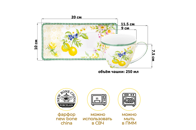 БЫЛО 1065 руб! Чашка 250 мл с блюдцем для десерта 20*10*2 см "Лимоны", NEW BONE CHINA