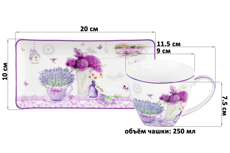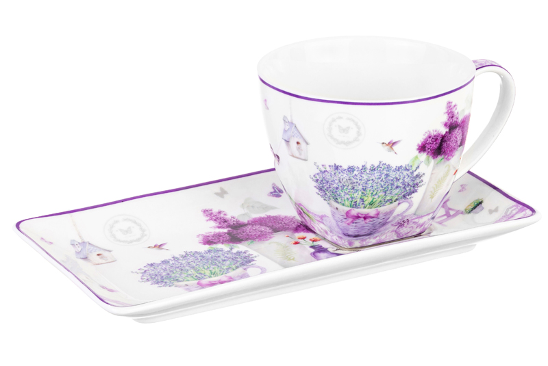 Чашка с блюдцем для десерта Elan Gallery "Лаванда" выполнены из фарфора нового поколения new bone china. New bone china сочетает в себе изящность и высокую прочность. От других видов костяного фарфора материал отличается большей экологичностью в производстве. Объём чашки – 250 мл, размер блюдца – 20х10х2 см. Блюдечко имеет необычную прямоугольную форму. Серия "Лаванда" украшена нежным принтом на тему Прованса – французской провинции, которая славится своими лавандовыми полями и красивыми пейзажами. Изображение пышных букетов лаванды и гортензии позволит окунуться в атмосферу тепла, гармонии и южного солнца, не покидая вашей кухни или столовой! Кружка с блюдцем подходят ценителям чая и кофе, которые любят пить из красивой и необычной посуды. Интересная чашка с удобной ручкой украсит ваш стол своим стильным дизайном как на праздник, так и в будни. Это идеальный вариант для того, чтобы согреться горячим чаем зимой и освежиться прохладным лимонадом летом. Используйте блюдце как подставку под чашку, чтобы порадовать гостей изящной сервировкой. Положите на блюдце кусочек торта, домашнего пирога или пирожное. Небольшая тарелочка подойдёт не только для десерта, но и закусок: сырной нарезки, сырокопчёной колбасы или свежих овощей и зелени. Не рекомендуется применять абразивные моющие средства. Набор можно использовать в микроволновой печи и посудомоечной машине. Поставляется в красивой картонной коробке. Станет приятным подарком вашим близким на любой праздник. Благодаря стильной коробочке не понадобится подарочная упаковка. Чашка с десертным блюдцем станут украшением вашей кухни или приятным сюрпризом для близких!