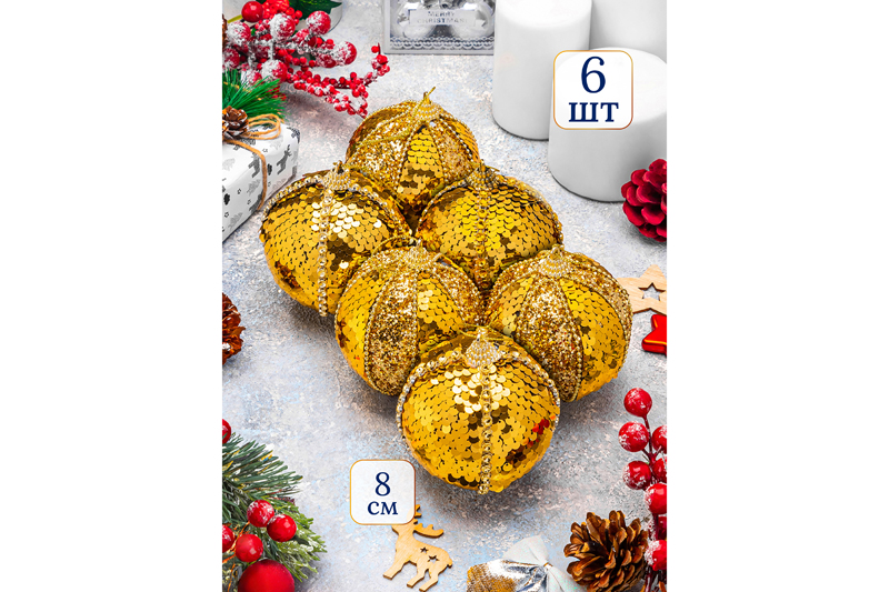БЫЛО 1081 руб! Набор 6 новогодних шаров 8*8 см "Золотые пайетки"