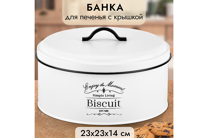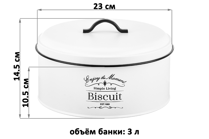 Банка для печенья белого цвета от Elan Gallery – это стильное решение для хранения лакомств! Размер 23х23х14,5 см, объём 3 литра. Высота без крышки 10,5 см. Выполнена из металла с пудровым покрытием, что обеспечивает долговечность использования. Круглый контейнер украшен надписями чёрного цвета: "Enjoy the moment" ("Наслаждайся моментом"), "Simply living" ("Жить просто") и "Biscuit" ("Печенье"). Фраза "Simply living" – это отсылка к интерьерным решениям для кухни, направленным на упрощение вашей жизни. Благодаря кухонному органайзеру любимые сладости будут под рукой! Металлическая крышечка с ручкой в форме петельки защищает продукты от пыли и влаги. Сервировочная ёмкость дополнит вашу коллекцию кухонного инвентаря. Благодаря стильному дизайну баночка станет предметом декора кухни или столовой, украсит интерьер. Храните в ней вафли и пряники. Органайзер подойдёт для пакетов с выпечкой и большого количества конфет. В большую баночку уместится много конфеток и шоколадок, в отличие от декоративной конфетницы или вазочки. Можно использовать для сервировки. Красивая подача угощений к чаю позволит создать особую атмосферу. Альтернативный вариант использования железной коробочки – для хранения украшений или швейных принадлежностей. Не рекомендуется применять абразивные моющие средства. Нельзя использовать в посудомоечной машине. Банка для печенья от Elan Gallery позволит эстетично хранить любимые лакомства и удивит ваших гостей. Станет полезным подарком на любой праздник мужчинам и женщинам. Поставляется в стильной картонной коробке. Благодаря красочной коробочке не понадобится подарочная упаковка. В коллекции бренда Элан Галерея представлено много товаров для дома. Здесь вы найдёте банки для хранения круп и других сыпучих продуктов, а также хлебницы. Соберите набор посуды для вашей кухни в едином стиле!