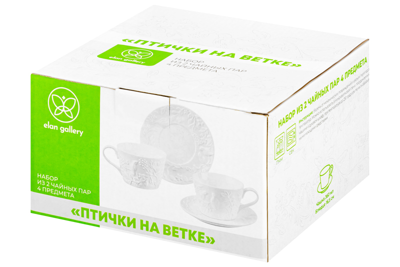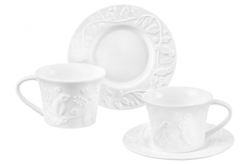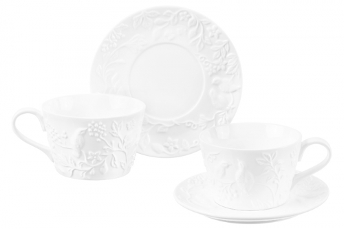 Набор из 2-х чайных пар серии "Птички на ветке" поможет провести множество приятных чаепитий. Чашки в наборе имеют объем по 360 мл, диаметр каждого блюдечка 16,5 см. Чайные пары выполнены из высококачественного фарфора и украшены рельефными изображениями птичек с растительными орнаментами. Подходят для чая, кофе, сока, лимонадов и других напитков. Фарфор не впитывает цвет напитков и не деформируется от влаги. Такие чайные пары долгое время будут выглядеть, как новые! Подходят для использования в микроволновой печи и посудомоечной машине. В наборе 4 предмета: 2 чашки и 2 блюдца. Поставляются в яркой картонной упаковке. Чайные пары из серии посуды "Птички на ветке" смогут стать настоящим украшением кухни или приятным подарком для ваших родных и близких!