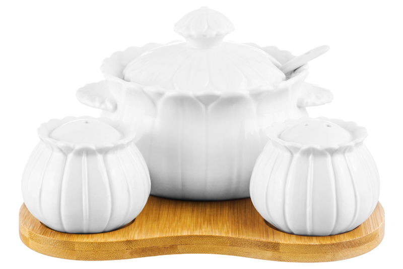 Набор «Цветок» состоит из сахарницы с крышкой и ложкой, баночек для соли и перца и деревянной подставки. Набор выполнен из высококачественного фарфора и натурального бамбука. Размер набора 17,5х16х10 см. Сахарница имеет объем 400 мл и размер 13х11х9 см. Объем каждой баночки для специй 70 мл, размер 6х6х5 см. У сахарницы широкое горло, благодаря чему ей удобно пользоваться. Емкости для специй заполняются снизу и закрываются пластиковыми пробками. Сахарницу с крышкой, ложку и емкости без пробок можно использовать в микроволновой печи и посудомоечной машине. Деревянную подставку и пластиковые пробки нельзя использовать в микроволновой печи и посудомоечной машине. Набор поставляется в прочной картонной упаковке и сможет стать приятным подарком для ваших родных и близких!