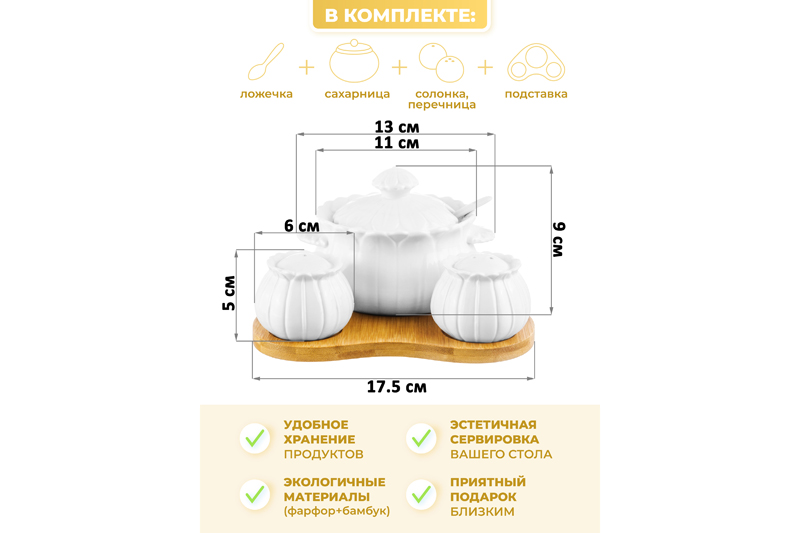 БЫЛО 1105 руб! Набор - сахарница 400 мл 17,5*16*10 см "Цветок" с ложкой + солонка + перечница на дерев.подставке