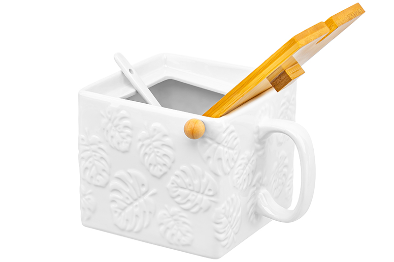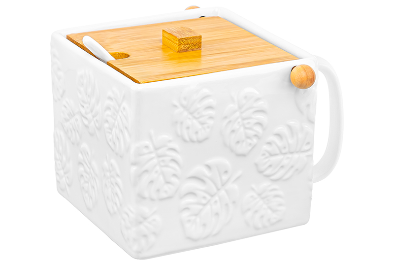 Банка для сыпучих продуктов с бамбуковой крышкой и фарфоровой ложкой из серии «Тропики» предназначена для красивой сервировки вашего стола. Размер изделия – 16,5х15х12 см, объём – 1 литр. Вмещает 980 граммов сахара или 1,3 килограмма соли. Выполнена из высококачественного белого фарфора, крышка изготовлена из натурального бамбука. Фарфор не впитывает цвет продуктов и легко отмывается, благодаря чему надолго сохранит свою белизну. Поверхность изделия украшают рельефные узоры в виде тропических листьев. Декоративная баночка гармонично дополнит сервировку любого стола и добавит особого шарма вашему кухонному инвентарю. Вместительный контейнер подойдёт для хранения сахара и соли, специй, приправ и других сыпучих продуктов. Эстетичную ёмкость с крышечкой можно приспособить не только под сахар, но и под варенье, мёд или икру. Вы с лёгкостью наберёте необходимое количество продукта ложечкой, которая компактно помещается в баночку благодаря выемке на крышке. Она отлично послужит в качестве медовницы и станет альтернативой традиционным медовым горшочкам и бочонкам! Не рекомендуется применять абразивные моющие средства. Не подходит для использования в посудомоечной машине и микроволновой печи. Бамбук нельзя замачивать! Поставляется в дизайнерской коробке – благодаря ей вам не потребуется дополнительная подарочная упаковка. Фарфоровая сервировочная посуда послужит оригинальным подарком для хозяйки, ценящей не только практичность, но и привлекательность. Серия «Тропики» станет украшением любого кухонного инвентаря и позволит собрать сервиз в едином стиле!