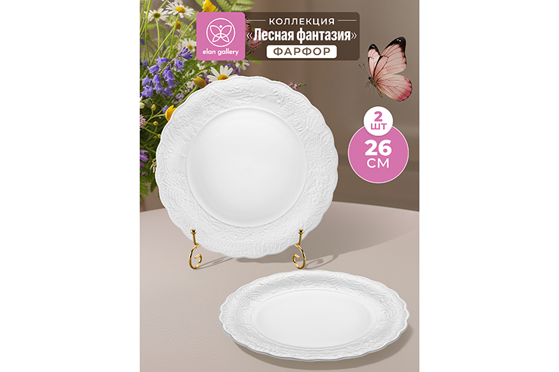 Набор 2 тарелок Elan Gallery "Лесная фантазия" предназначен для эстетичной сервировки вашего стола. Размер каждого изделия – 26,5х26,5х2 см. Тарелки выполнены из белого фарфора, имеют волнистые края. Коллекция посуды "Лесная фантазия" украшена изящным рельефным узором в виде цветов и порхающих бабочек. Она навевает фантазии о лесной поляне — благоухающей и согретой лучами солнца. Сервировочный набор отлично подойдёт для подачи вторых блюд и закусок. Заполните их пастой и деликатесами из рыбы, красиво выложите нарезку из свежих овощей и фруктов, сыров и яиц. Положите роллы и суши для вкусного перекуса. Блюда помогут преподнести разнообразные десерты, сладости и выпечку. Элегантные тарелочки впишутся в интерьер любой кухни или столовой. Не рекомендуется применять абразивные моющие средства. Беречь от резких перепадов температур и механических повреждений. Комплект подходит для использования в микроволновой печи и посудомоечной машине. Поставляется в стильной картонной коробке. Вам не придётся искать дополнительную подарочную упаковку, чтобы сделать сюрприз близким на праздник. Праздничная посуда – хороший вариант для подарка. В коллекции бренда Элан Галерея можно найти много красивого кухонного и столового инвентаря, а также собрать сервиз на свой вкус. Коллекция "Лесная фантазия" от Elan Gallery наполнит повседневные моменты лёгкостью и сказочной атмосферой, а также позволит создать красивую сервировку праздничного стола!