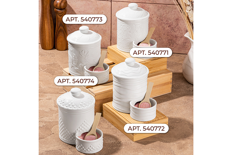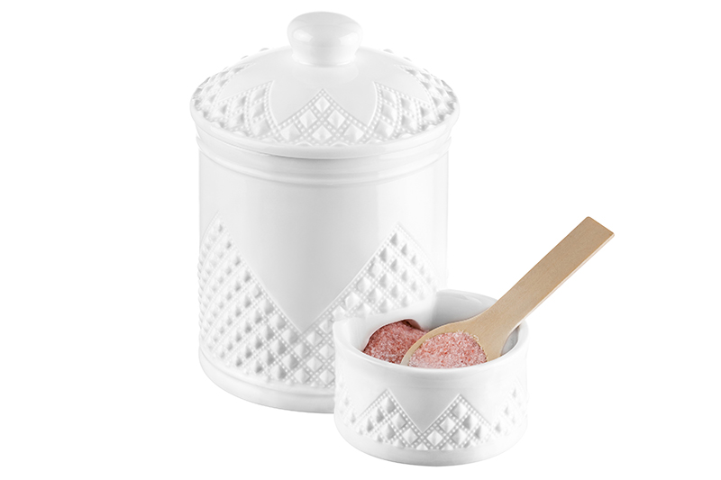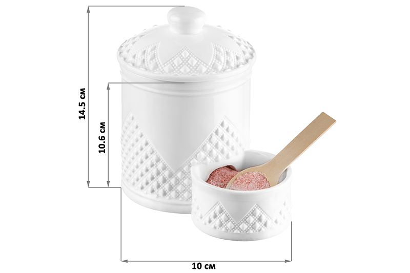 Банка из серии «Ромбики» от Elan Gallery послужит для организации хранения продуктов на вашей кухне. Размер ёмкости – 15,5х10х14,5 см, объём – 500 мл. Высота внешней солонки – 4 см, объём – 75 мл. Выполнена из высококачественного белого фарфора. Он не впитывает цвет продуктов и легко отмывается, благодаря чему надолго сохранит свою белизну. Поверхность украшена рельефным геометрическим узором. Ложка выполнена из натурального бамбука. Ёмкость подойдёт для хранения разнообразных сыпучих продуктов. Заполните её сахаром и солью, специями и приправами, чтобы во время приготовления и приёма пищи всё необходимое было под рукой. Засыпьте внутрь чай или кофе, чтобы в любой момент заварить свежий напиток. Подайте вместе с горячими блюдами, чтобы каждый мог приправить пищу по своему вкусу. Ложечка поможет удобно набрать необходимое количество продуктов. Банка имеет оригинальную форму, которая позволяет эффективно расходовать содержимое и предотвращать скопление остатков на дне. Такое изделие отлично дополнит сервировку стола как для сытного завтрака, так и для уютного чаепития. Не рекомендуется применять абразивные моющие средства. Без ложки подходит для использования в посудомоечной машине и микроволновой печи. Бамбук нельзя замачивать! Поставляется в дизайнерской картонной коробке – благодаря ей вам не потребуется дополнительная подарочная упаковка. Фарфоровая сервировочная посуда будет оригинальным подарком для хозяйки, ценящей не только практичность, но и привлекательность. Серия «Ромбики» от бренда Элан Галерея станет украшением любого кухонного инвентаря и позволит собрать красивый сервиз в едином стиле!