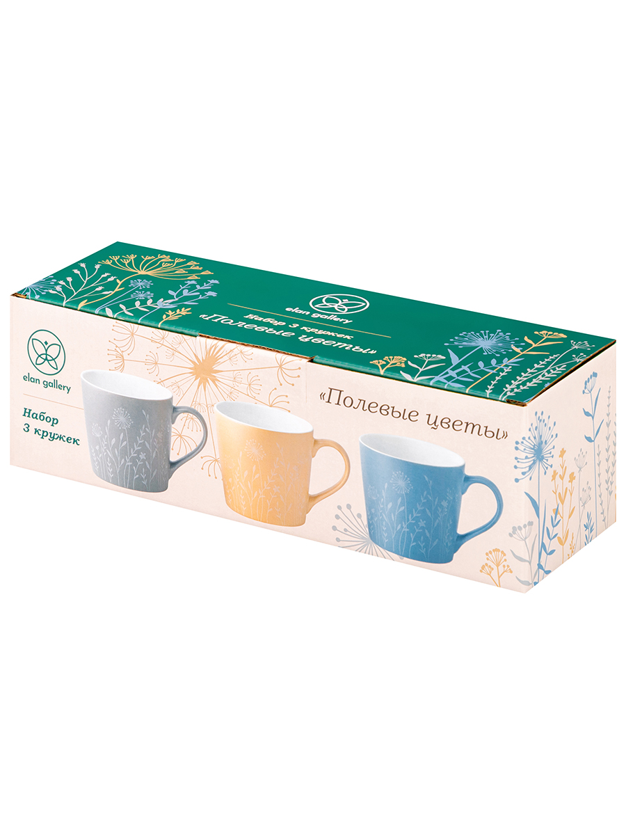 Набор 3 кружек «Полевые цветы» от Elan Gallery предназначен для эстетичной сервировки вашего стола. Размер каждого изделия – 13х9,5х9 см, объём – 400 мл. Включает изделия серого, бежево-золотистого и голубого цвета. Их матовая поверхность покрыта тонкими глянцевыми узорами в виде белёсых полевых соцветий. Выполнены из высококачественного белого фарфора. Он не впитывает цвет напитков и легко отмывается, благодаря чему надолго сохраняет свой оттенок. Кофейные кружки помогут вам провести множество приятных завтраков с капучино и латте, а также уютные чайные вечера с конфетами, вафлями, другими десертами и сладостями. Подойдут ценителям чая и кофе, которые любят пить из красивой и необычной посуды. Согрейтесь зимой любимым напитком: какао с маршмэллоу, ягодным чаем или горячим шоколадом. Летом освежитесь домашним лимонадом или морсом. Благодаря нежному дизайну комплект впишется в интерьер любой кухни, гостиной или столовой. Не рекомендуется применять абразивные моющие средства. Подходят для использования в посудомоечной машине и микроволновой печи. Поставляются в дизайнерской картонной коробке – благодаря ей вам не потребуется дополнительная подарочная упаковка. Наслаждайтесь ароматными напитками из кружек от бренда Элан Галерея и добавьте в повседневность комфорт и эстетику!