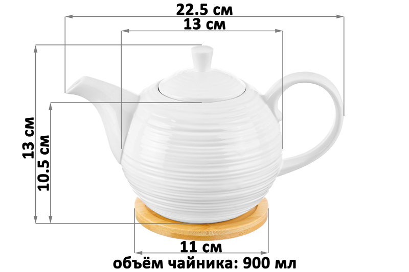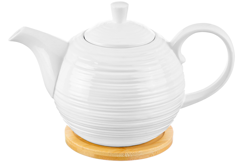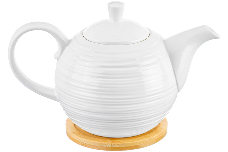 Чайник Elan Gallery "Шёлк" объёмом 900 мл выполнен из белого фарфора и украшен рельефными узорами. Имеет в комплекте круглую подставку из натурального бамбука размером 11х11х1 см. Размер чайника вместе с подставкой – 22,5х13х14 см. Фарфоровый чайничек подходит для любителей чёрного, зелёного или травяного чая. Вы сможете насладиться своими любимыми напитками и удивить гостей красивой сервировкой стола как в будни, так и на праздник. Подарочный чайник удобен в использовании. Он оснащен фильтром в виде маленьких отверстий в стеночке, благодаря которому вы сможете наслаждаться ароматной заваркой без попадания мелких чаинок. На фарфоровой крышке с обратной стороны есть небольшой выступ, чтобы она хорошо держалась на чайнике. Не рекомендуется применять абразивные моющие средства. Без бамбуковой подставки можно использовать в микроволновой печи и мыть в посудомоечной машине. Бамбук нельзя замачивать! Поставляется в стильной картонной упаковке. Подарите чайник из фарфора маме, бабушке, подруге, коллеге или сестре. Его красивый дизайн и функциональность понравятся каждому, а высокое качество фарфора обеспечит долговечность этого подарка. Заварочный чайник из серии "Шёлк" на бамбуковой подставке станет украшением любой кухни или приятным подарком для ваших родных и близких!