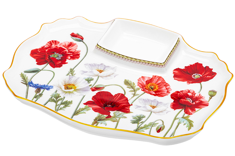 БЫЛО 1185 руб! Блюдо д/шашлыка 28*21*2,3 см "Маки" с соусницей NEW BONE CHINA