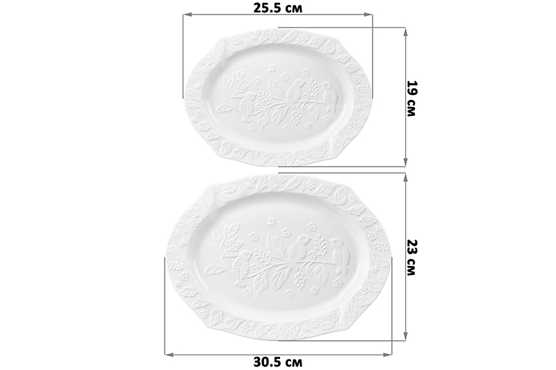 Набор состоит из 2-х блюд серии "Птички на ветке" разных размеров: 30,5х23х2 см и 25,5х19х2 см. Такие блюда подойдут для подачи главных блюд, закусок, десертов и самых разных продуктов. Блюда выполнены из высококачественного фарфора и украшены рельефными изображениями птичек с растительными орнаментами. Подходят для использования в микроволновой печи и посудомоечной машине. Поставляются в яркой картонной упаковке. Блюда из серии посуды "Птички на ветке" смогут стать настоящим украшением кухни или приятным подарком для ваших родных и близких!