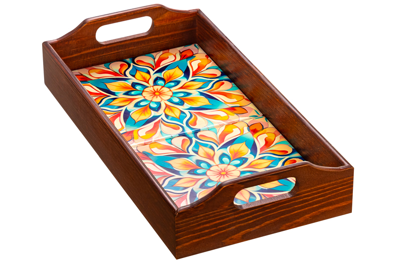 Прямоугольный поднос «Яркий орнамент» от Elan Gallery поможет в эстетичной сервировке любимых блюд. Размер изделия – 31,5х16,5х6,5 см, толщина дна – 1,5 см. Высокие бортики выполнены из дерева, дно сложено из декоративных керамических плиток с ярким орнаментом. Каждое изделие изготавливается вручную, поэтому точный вид орнамента может варьироваться. Поднос идеально подойдёт для эстетичной подачи разнообразных угощений. Заполните его сервировочной посудой – прочные ручки помогут перенести содержимое между комнатами. Это изящный способ подать шашлык, сыр, фрукты и вино для романтического вечера. Преподнесите завтрак в постель с любимым кофе, проведите уютные перекусы на веранде или устройте неторопливую чайную церемонию. Многофункциональный поднос также послужит в качестве универсального органайзера. В спальне храните в нём косметику, украшения и парфюмерию. На столе заполните канцелярией, блоками записных листов, баночками с аромадиффузорами. Это идеальный вариант для создания декоративной композиции с фигурками, свечами и другими аксессуарами. Поднос станет оригинальным подарком для тех, кто ценит необычные вещи. Не рекомендуется применять абразивные моющие средства. Нельзя замачивать, не использовать в посудомоечной машине и микроволновой печи. Поставляется в дизайнерской картонной коробке – благодаря ей вам не потребуется дополнительная подарочная упаковка. В коллекции бренда Элан Галерея представлено много красивой посуды и стильных товаров для дома – выберите варианты на свой вкус!