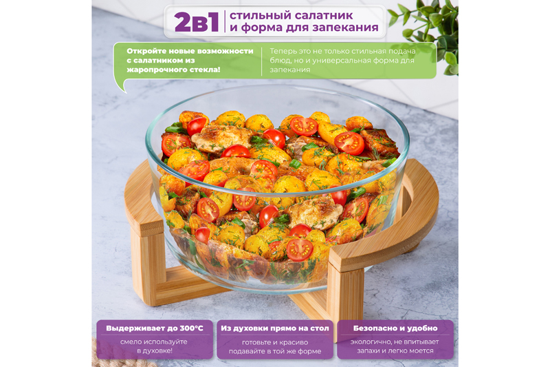 БЫЛО 1218 руб! Блюдо для сервировки и запекания 1,4 л 21,5*18*10,5 см "GLASKRAFT" круглое с бамбуковой подставкой