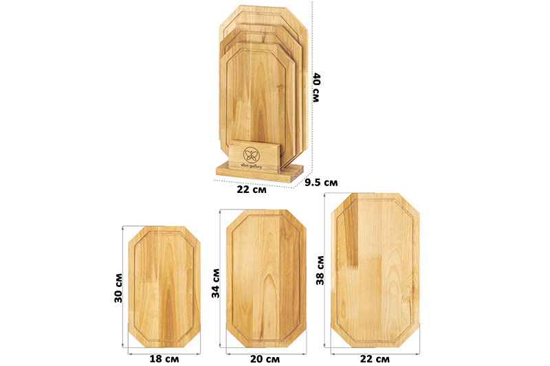 Набор состоит из трех разделочных досок и подставки. Доски выполнены из березы и различаются по размеру: 38х22х1,8 см, 34х20х1,8 см и 30х18х1,8 см. Такой набор станет не только надежным помощником в резке продуктов, но и стильным украшением кухни. По краям досок имеются канавки для жидкостей, чтобы сок от овощей и мяса не попадал на стол. Доски подходят для красивой сервировки жареного мяса, овощей и прочих блюд. Доски уже пропитаны маслом. После каждого использования протирать влажной губкой. Не замачивать в воде. После мытья под струей воды протереть насухо. Не сушить около отопительных приборов и рядом с плитой. Хранить вертикально или в подвешенном состоянии в помещении с нормальным уровнем влажности. Не использовать в качестве подставки под горячее. Не мыть химическими средствами или в посудомоечной машине. Рекомендуется не реже одного раза в месяц обрабатывать все стороны растительным маслом. Так доска прослужит долго и будет радовать красотой и функциональностью!
