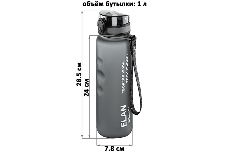 Бутылка для воды «Style Matte» от Elan Gallery – это практичное и стильное решение для ценителей активного образа жизни. Размер ёмкости – 7,8х7,8х28,5 см. Высота до крышки – 24 см. Объём – 1 литр. Изделие выполнено из тритана – прочного, безопасного материала, не содержащего бисфенол А. Этот пластик не впитывает запахи и не влияет на вкус напитков. Бутылочка подходит как для холодной, так и для горячей жидкости. Освежитесь любимыми летними напитками в жару или согрейтесь ароматным чаем зимой! Матовое покрытие и углубления для пальцев обеспечивают комфортное использование на прогулке, в офисе и на тренировке в зале. Надёжная крышка с герметичным клапаном препятствует проливанию, а встроенное ситечко позволит заваривать напитки с травами и фруктами. С удобным ремешком бутылку можно закрепить на рюкзаке – это позволяет брать её в путешествия, поездку на велосипеде или автомобиле. Многоразовая дорожная бутылка подходит как для туризма, так и для пикника на природе. Удобная форма делает её не только туристическим, но и спортивным инвентарём. Большая пластиковая ёмкость для питья с мотивационной шкалой – прекрасный вариант для занятий фитнесом, йогой или бегом в спортзале или на свежем воздухе. Она также дополнит занятия велоспортом в качестве велосипедного аксессуара. Это надёжный помощник спортсменам во время игры в футбол или волейбол, занятий гимнастикой и танцами. Подходит как для взрослых, так и для школьников – её можно взять в школу и на занятия физкультурой. Благодаря универсальному дизайну и серому цвету она подойдёт как девочкам, так и мальчикам. Функциональная бутылка в дизайнерской картонной упаковке – это готовый подарок для женщин и мужчин. Не подходит для микроволновой печи, посудомоечной машины и стерилизатора. В коллекции бренда Элан Галерея представлена разнообразная посуда и товары для дома на любой вкус. Спортивные аксессуары из серии «Style Matte» помогут следить за водным балансом, где бы вы ни находились!