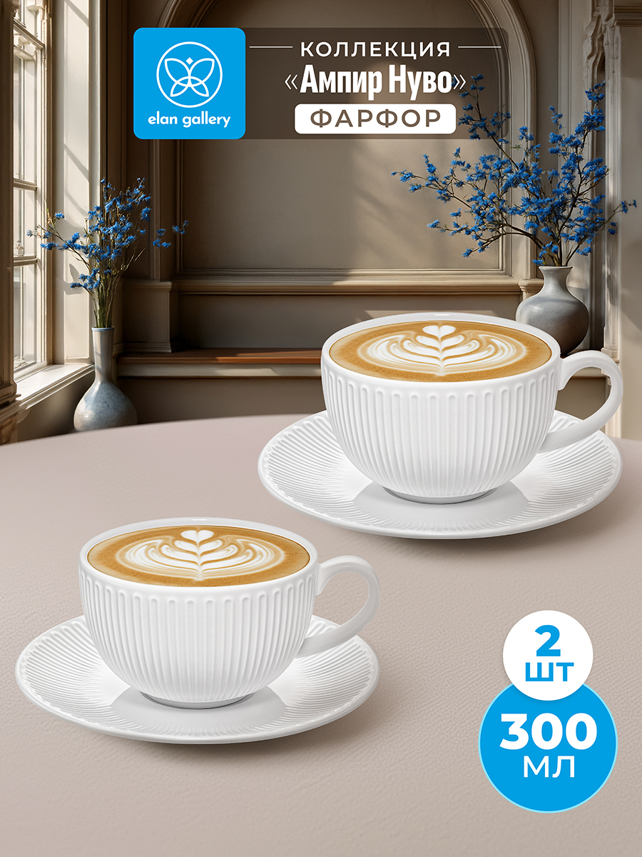 Набор 2 чайных пар Elan Gallery "Ампир Нуво" выполнен из белого фарфора и украшен лаконичным рельефом. Ритмичный, архитектурный узор продолжает эстетику, вдохновлённую стилем ампир, и переосмысляет её в новом ключе. Объём каждой чашки – 300 мл, размер – 13х10х6,5 см. Размер каждого блюдца – 16х16х2 см. Чашки с блюдцами для десерта украсят ваш стол своим эстетичным дизайном как на праздник, так и в будни. Используйте блюдце как подставку для чашки, чтобы порадовать гостей изящной сервировкой. Положите на десертную тарелку кусочек торта, домашнего пирога или пирожное. Небольшая тарелочка подойдёт не только для десерта, но и закусок: сырной нарезки, сырокопчёной колбасы или свежих овощей и зелени. В отличие от керамики фарфор не впитывает цвет напитков, легко отмывается, поэтому сохраняет свою белизну долгое время. Беречь от резких перепадов температур и механических повреждений. Не рекомендуется применять абразивные моющие средства. Комплект можно использовать в микроволновой печи и посудомоечной машине. Поставляется в красивой картонной коробке, поэтому вам не понадобится дополнительная подарочная упаковка, если вы решите преподнести сюрприз. Изящный набор на 2 персоны станет приятным подарком на любой праздник и добавит эстетики каждому чаепитию. В коллекции бренда Элан Галерея представлено много стильных товаров для дома, в том числе всё для создания красоты и уюта на кухне. Коллекция "Ампир Нуво" от Elan Gallery придаст элегантности повседневной сервировке и станет украшением праздничного стола!
