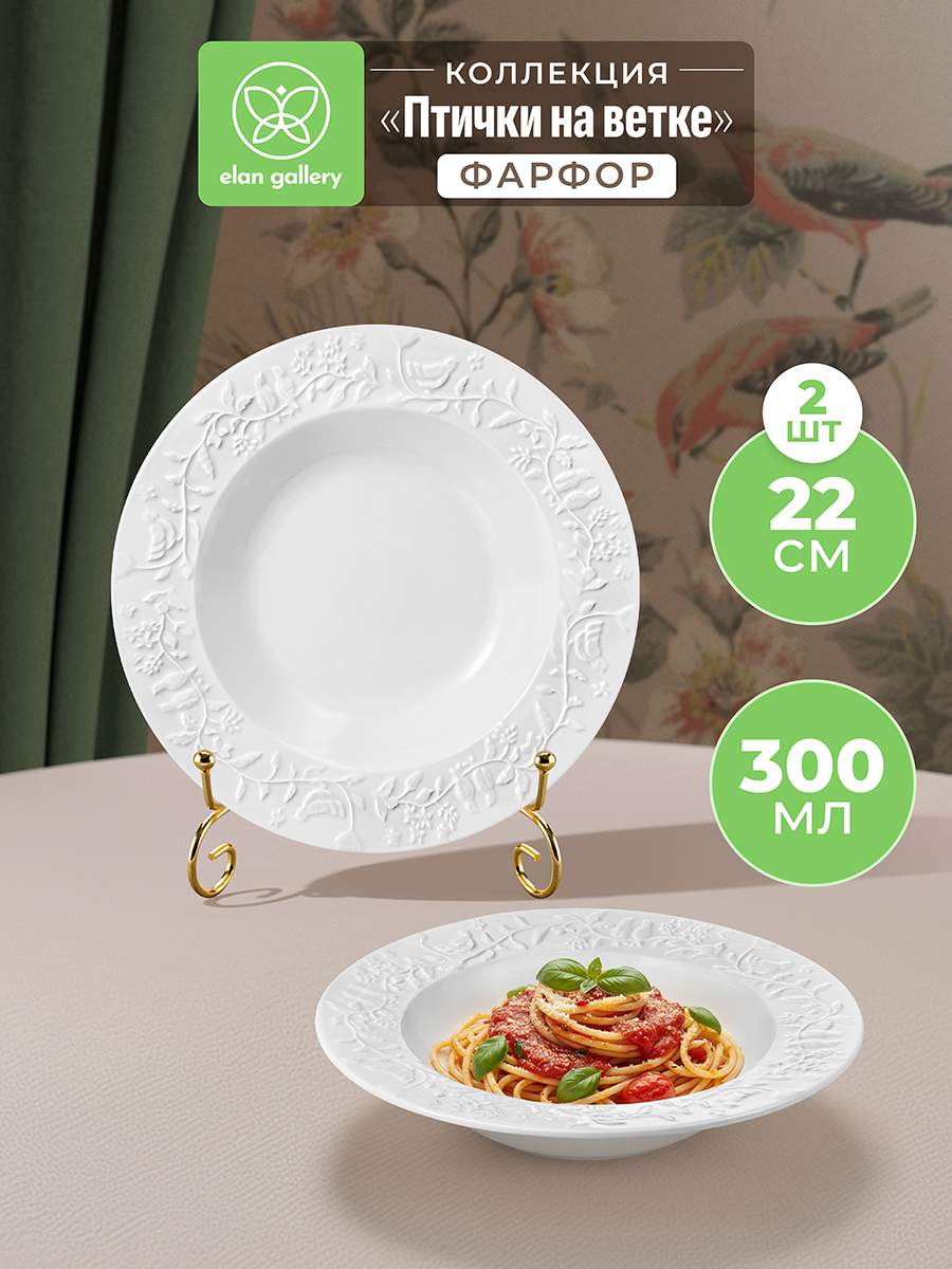 Набор 2 суповых тарелок от бренда Elan Gallery "Птички на ветке" выполнен из белого фарфора. Размер каждого изделия — 22х22х4 см, объём – 300 мл. Глубокие блюда украшены рельефными узорами. Фарфоровая посуда станет изящным дополнением интерьера любой кухни или столовой. В отличие от керамики она не впитывает цвет пищи, легко отмывается и надолго сохраняет привлекательный вид. Глубокие тарелочки подойдут для подачи супа, бульона и каши. Эргономичная форма позволяет использовать их не только для первых блюд, но и рагу, салатов и пасты. Удобно для любого гарнира. Красивые блюда подойдут для сервировки как на праздник, так и в будни. Беречь от механических повреждений и резких перепадов температур. Не рекомендуется применять абразивные моющие средства. Можно использовать в посудомоечной машине и микроволновой печи. Комплект поставляется в стильной картонной коробке. Благодаря ей не потребуется дополнительная подарочная упаковка, если решите сделать сюрприз своим близким. Набор станет приятным подарком на любой праздник и универсальным кухонным инвентарём в доме. В серии "Птички на ветке" представлена разнообразная столовая посуда, соберите сервиз на свой вкус!