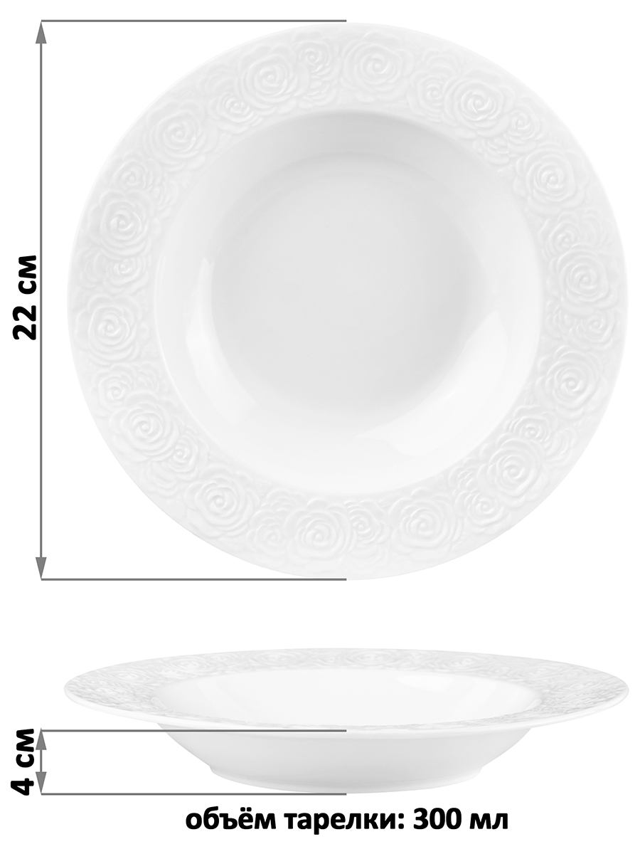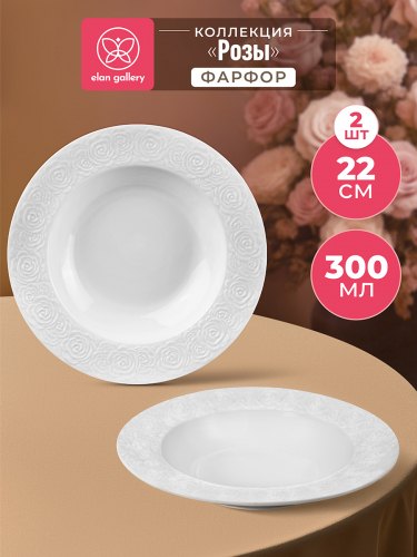 Набор 2 суповых тарелок от бренда Elan Gallery "Розы" выполнен из белого фарфора. Размер каждого изделия — 22х22х4 см, объём – 300 мл. Глубокие блюда украшены рельефными узорами в виде цветов. Фарфоровая посуда станет изящным дополнением интерьера любой кухни или столовой. В отличие от керамики она не впитывает цвет пищи, легко отмывается и надолго сохраняет привлекательный вид. Глубокие тарелочки подойдут для подачи супа, бульона и каши. Эргономичная форма позволяет использовать их не только для первых блюд, но и рагу, салатов и пасты. Удобно для любого гарнира. Красивые блюда подойдут для сервировки как на праздник, так и в будни. Беречь от механических повреждений и резких перепадов температур. Не рекомендуется применять абразивные моющие средства. Можно использовать в посудомоечной машине и микроволновой печи. Комплект поставляется в стильной картонной коробке. Благодаря ей не потребуется дополнительная подарочная упаковка, если решите сделать сюрприз своим близким. Набор станет приятным подарком на любой праздник и универсальным кухонным инвентарём в доме. В серии "Розы" представлена разнообразная столовая посуда, соберите сервиз на свой вкус!