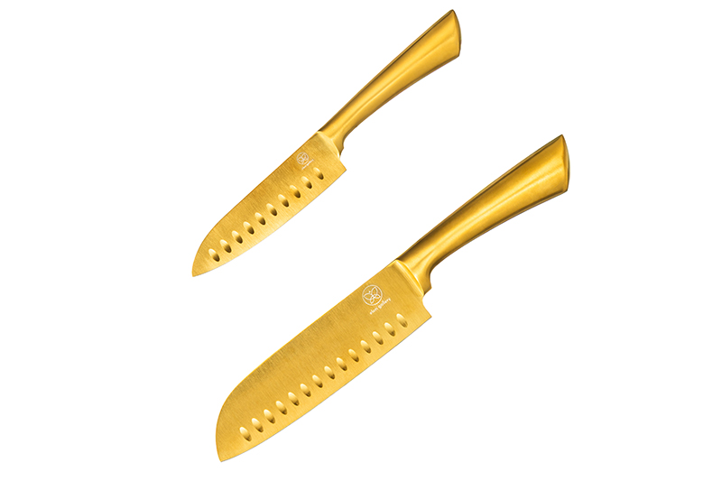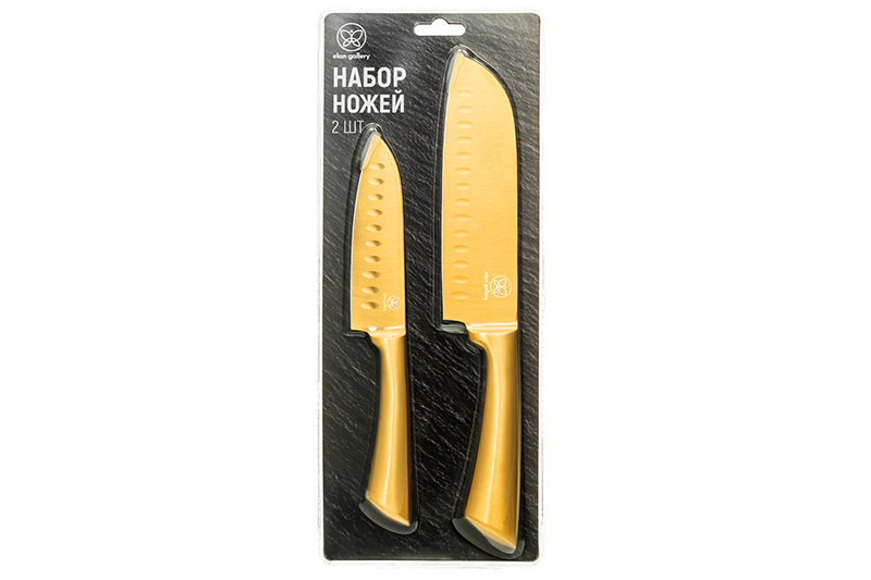 Набор Elan Gallery состоит из двух ножей разной длины золотого цвета. Выполнен из нержавеющей стали. В комплект входят: универсальный нож размером 25,5х2,5х3,5 см (длина клинка – 13 см, длина рукоятки – 12,5 см, толщина рукоятки – 2,5 см, толщина обуха – 0,15 см), поварской шеф-нож размером 32х3,5х4,7 см (длина клинка – 17,5 см, длина рукоятки – 14,5 см, толщина рукоятки – 3,5 см, толщина обуха – 0,2 см). Каждое лезвие имеет маленькую защитную накладку на конце. Набор золотистого цвета станет незаменимым помощником в процессе готовки и отлично справится с разделкой мяса или рыбы. Каждый нож с фигурной ручкой имеет острое лезвие с логотипом бренда. Это универсальные кухонные принадлежности. Их можно использовать как овощные, мясные или хлебные ножи. Ножик поменьше подойдет для нарезки колбасы, сыра, хлеба или овощей. Его острое лезвие позволяет производить точные и аккуратные надрезы. Благодаря длинному лезвию нож позволяет резать продукты легко и без усилий. Большой разделочный нож можно использовать для нарезки рыбы, мяса или шинковки капусты. Удобная рукоятка обеспечивает комфортную работу с ножом. Эти универсальные кухонные принадлежности удобны в использовании как мужчинами, так и женщинами. Набор ножей с лезвиями из нержавеющей стали станет отличным помощником для профессионального повара. Не рекомендуется применять абразивные моющие средства. Нельзя мыть в посудомоечной машине. Этот набор станет незаменимым инвентарём на вашей кухне и поможет в приготовлении множества вкусных блюд! В коллекции бренда Элан Галерея представлено много стильных товаров для дома и столовой посуды, выберите варианты на свой вкус.