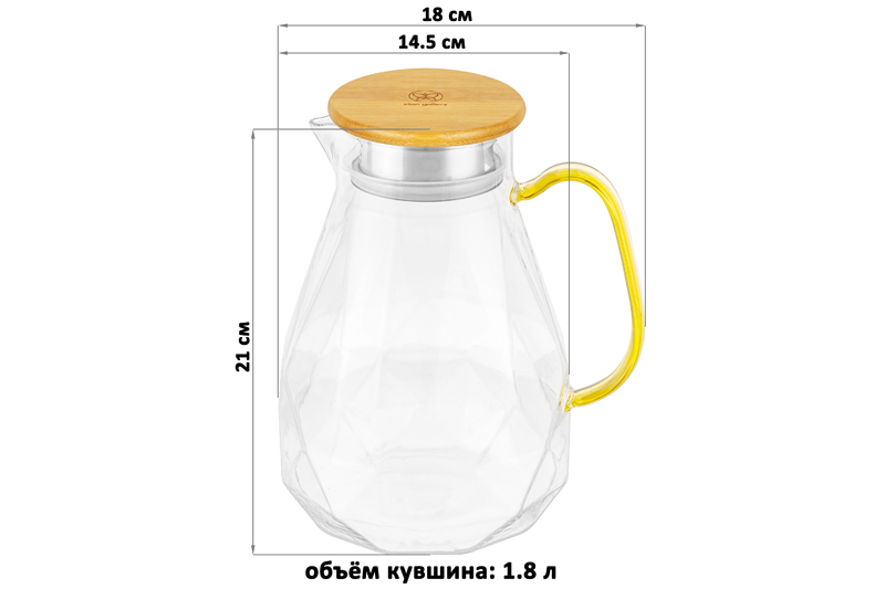 Кувшин Crystal glass объемом 1,8 литра выполнен из боросиликатного стекла и имеет удобную ручку. Наполненный соком или чаем, он поможет организовать дружеские встречи и украсит ваш стол. Жаропрочное стекло выдерживает от -20 до +150 градусов и позволит заварить чай, а потом остужать в той же емкости. Не имеет в составе вредных веществ, не впитывает запахи и вкусы. Подходит для холодных и горячих напитков. Прозрачный сосуд можно использовать как чайный заварник или молочник для хранения свежего молока. Стеклянный кувшин многофункциональный и жаростойкий: вам не понадобится отдельный чайник для заваривания. Можно приспособить как ёмкость для чистой питьевой воды, либо под алкогольные напитки на празднике. Что может быть лучше холодного лимонада или компота из ягод в жару на даче! Используйте кувшин как лимонадницу или для эстетичной сервировки вина и коктейлей. Благодаря жаропрочному стеклу кувшин походит для сервировки горячего ароматного глинтвейна с фруктами. Наслаждайтесь тёплыми напитками зимой или дождливой осенью! Крышка выполнена из натурального бамбука и имеет силиконовый уплотнитель. Она прочно сидит даже при наклоне и хорошо сохраняет тепло. Фильтр из нержавеющей стали обладает ионным покрытием и гипоаллергенными свойствами. Размер графина 18х14,5х21 см. Не подходит для использования на плите и открытом огне. Без крышки лимонадник можно использовать в микроволновой печи и посудомоечной машине. Поставляется в стильной картонной коробке. Благодаря красочной коробочке вам не понадобится дополнительная подарочная упаковка! Станет приятным подарком для ваших близких на любой праздник. В серии Crystal glass можно найти много разнообразных кувшинов и графинов, которые подходят для горячей жидкости. Красивая посуда, кухонный инвентарь и товары для дома от Elan Gallery позволят создать уют на вашей кухне или в столовой!
