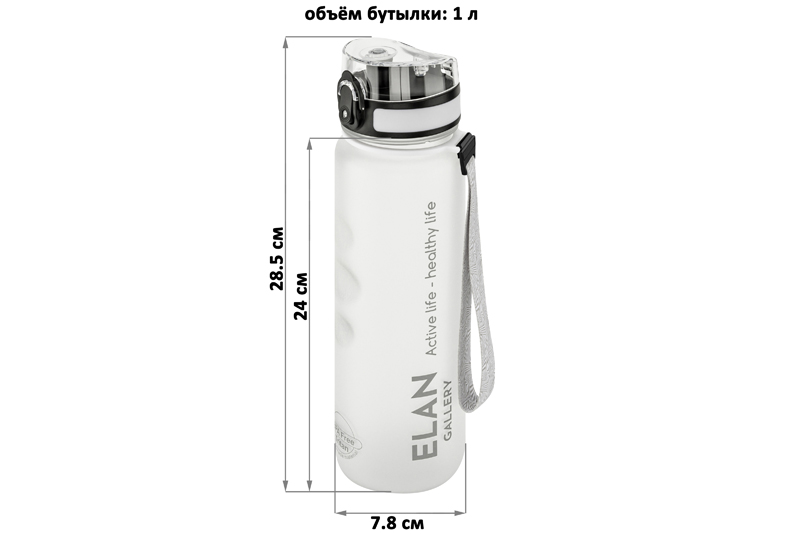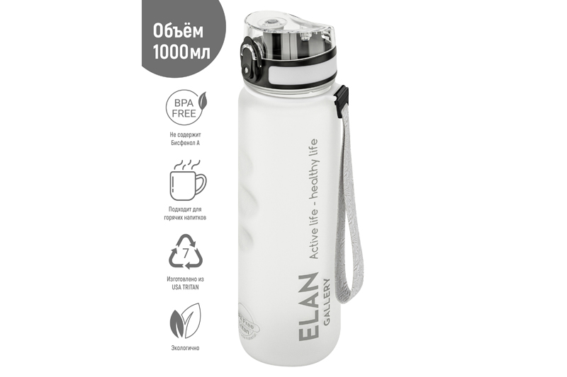 Бутылка для воды «Style Matte» от Elan Gallery – это практичное и стильное решение для ценителей активного образа жизни. Размер ёмкости – 7,8х7,8х28,5 см. Высота до крышки – 24 см. Объём – 1 литр. Изделие выполнено из тритана – прочного, безопасного материала, не содержащего бисфенол А. Этот пластик не впитывает запахи и не влияет на вкус напитков. Бутылочка подходит как для холодной, так и для горячей жидкости. Освежитесь любимыми летними напитками в жару или согрейтесь ароматным чаем зимой! Матовое покрытие и углубления для пальцев обеспечивают комфортное использование на прогулке, в офисе и на тренировке в зале. Надёжная крышка с герметичным клапаном препятствует проливанию, а встроенное ситечко позволит заваривать напитки с травами и фруктами. С удобным ремешком бутылку можно закрепить на рюкзаке или запястье – это позволяет брать её в путешествия, поездку на велосипеде или автомобиле. Многоразовая дорожная бутылка подходит как для туризма, так и для пикника на природе. Удобная форма делает её не только туристическим, но и спортивным инвентарём. Большая пластиковая ёмкость для питья – прекрасный вариант для занятий фитнесом, йогой или бегом в спортзале или на свежем воздухе. Она также дополнит занятия велоспортом в качестве велосипедного аксессуара. Это надёжный помощник спортсменам во время игры в футбол или волейбол, занятий гимнастикой и танцами. Подходит как для взрослых, так и для школьников – её можно взять в школу и на занятия физкультурой. Благодаря универсальному дизайну и белому цвету она подойдёт как девочкам, так и мальчикам в качестве школьного аксессуара. Функциональная бутылка в дизайнерской картонной упаковке – это готовый подарок для женщин и мужчин. Не подходит для микроволновой печи, посудомоечной машины и стерилизатора. В коллекции бренда Элан Галерея представлена разнообразная посуда и товары для дома на любой вкус. Спортивные аксессуары из серии «Style Matte» помогут следить за водным балансом, где бы вы ни находились!