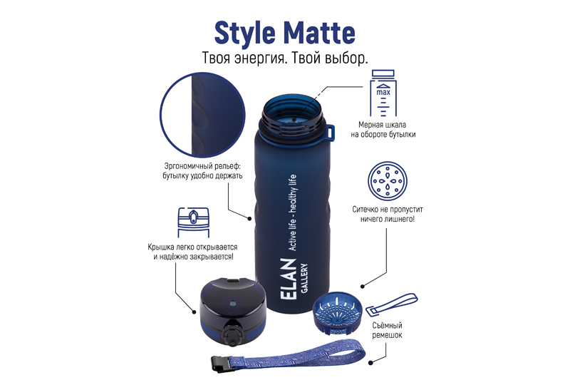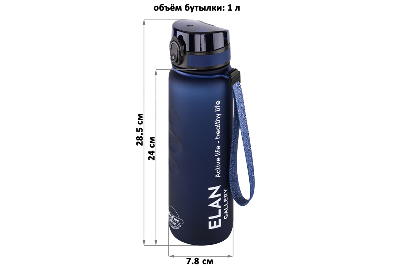 Бутылка для воды «Style Matte» от Elan Gallery – это практичное и стильное решение для ценителей активного образа жизни. Размер ёмкости – 7,8х7,8х28,5 см. Высота до крышки – 24 см. Объём – 1 литр. Изделие выполнено из тритана – прочного, безопасного материала, не содержащего бисфенол А. Этот пластик не впитывает запахи и не влияет на вкус напитков. Бутылочка подходит как для холодной, так и для горячей жидкости. Освежитесь любимыми летними напитками в жару или согрейтесь ароматным чаем зимой! Матовое покрытие и углубления для пальцев обеспечивают комфортное использование на прогулке, в офисе и на тренировке в зале. Надёжная крышка с герметичным клапаном препятствует проливанию, а встроенное ситечко позволит заваривать напитки с травами и фруктами. С удобным ремешком бутылку можно закрепить на рюкзаке или запястье – это позволяет брать её в путешествия, поездку на велосипеде или автомобиле. Многоразовая дорожная бутылка подходит как для туризма, так и для пикника на природе. Удобная форма делает её не только туристическим, но и спортивным инвентарём. Большая пластиковая ёмкость для питья – прекрасный вариант для занятий фитнесом, йогой или бегом в спортзале или на свежем воздухе. Она также дополнит занятия велоспортом в качестве велосипедного аксессуара. Это надёжный помощник спортсменам во время игры в футбол или волейбол, занятий гимнастикой и танцами. Подходит как для взрослых, так и для школьников – её можно взять в школу и на занятия физкультурой. Благодаря универсальному дизайну и тёмно-синему цвету она подойдёт как девочкам, так и мальчикам в качестве школьного аксессуара. Функциональная бутылка в дизайнерской картонной упаковке – это готовый подарок для женщин и мужчин. Не подходит для микроволновой печи, посудомоечной машины и стерилизатора. В коллекции бренда Элан Галерея представлена разнообразная посуда и товары для дома на любой вкус. Спортивные аксессуары из серии «Style Matte» помогут следить за водным балансом, где бы вы ни находились!