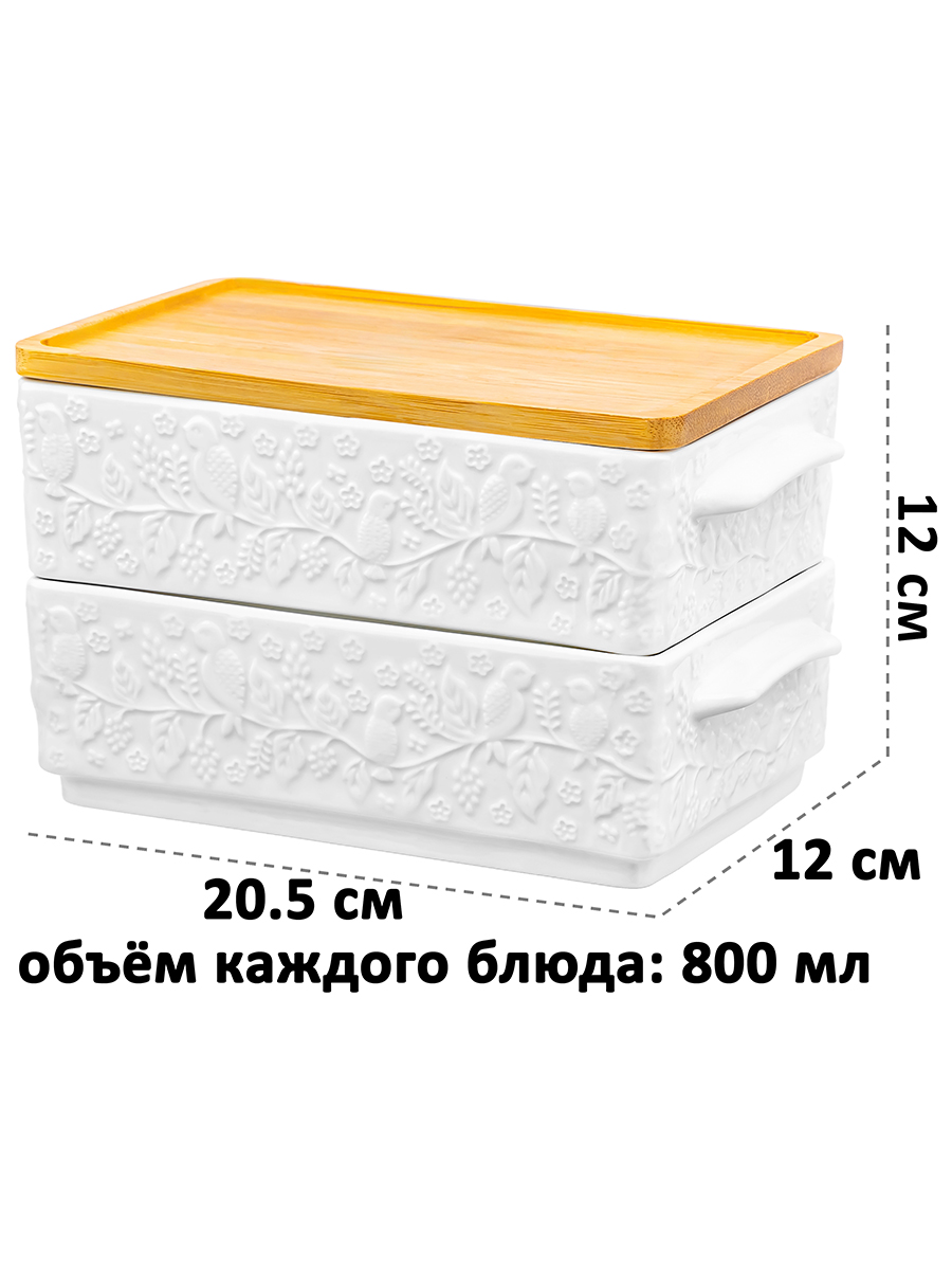 Набор 2 блюд для холодца из серии «Птички на ветке» предназначен для эстетичной сервировки стола. Общий размер набора – 20,5х12х12 см, высота конструкции без крышки – 11 см. Размер каждого изделия – 20,5х12х6 см, объём – 800 мл, внутренний размер – 17х11 см. Выполнены из высококачественного белого фарфора, крышка выполнена из натурального бамбука. Фарфор не впитывает цвет продуктов и легко отмывается, благодаря чему надолго сохраняет свою белизну. Поверхность изделий украшает рельефный узор в виде лиственных веточек, на которых расположились маленькие птички. Вместительные контейнеры подойдут для подачи сельди под шубой, салатов или плова, чтобы порадовать себя или гостей за праздничным столом. Используйте в качестве салатников или глубоких сервировочных блюд для эстетичной подачи закусок из мяса и рыбы. Такая посуда удобна для приготовления заливного, а также желе. Заполните каждое блюдо щедрой порцией мороженого, чтобы угостить большую компанию. Компактно храните штабелируемые блюда друг на друге. Лаконичный дизайн впишет их в интерьер любой кухни, гостиной или столовой. Без крышки подойдут для приготовления бисквита и творожных запеканок. Не рекомендуется применять абразивные моющие средства. Без крышки можно использовать в посудомоечной машине, микроволновой печи и духовом шкафу при температуре до 230 градусов. Бамбук нельзя замачивать! Поставляется в дизайнерской картонной коробке – благодаря ей вам не потребуется дополнительная подарочная упаковка. Фарфоровая сервировочная посуда станет оригинальным подарком для хозяйки, ценящей не только практичность, но и привлекательность. Серия «Птички на ветке» станет украшением любого кухонного инвентаря и позволит собрать красивый сервиз в едином стиле!
