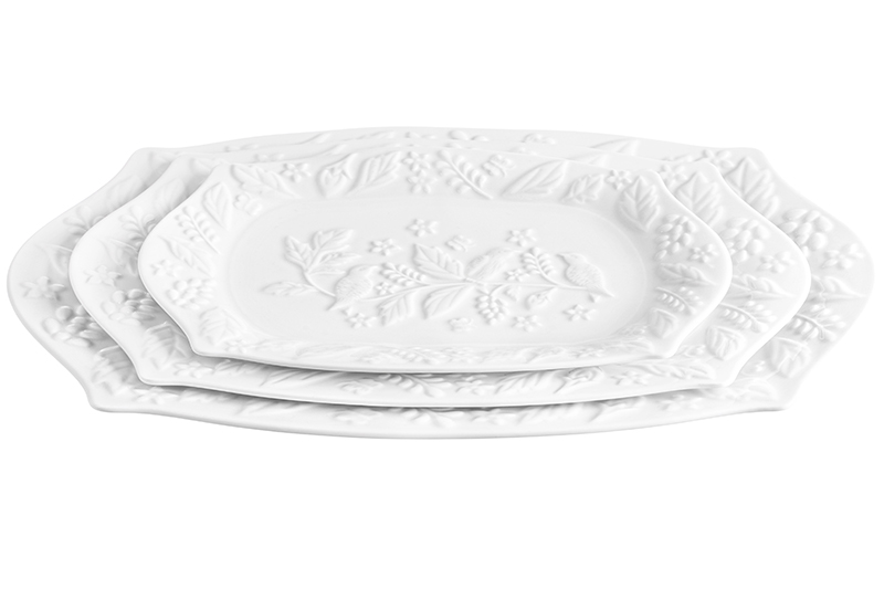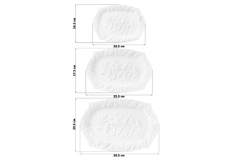 Набор 3 фигурных блюд «Птички на ветке» предназначен для эстетичной сервировки стола. В него входят блюда разного размера: первое – 30,5х20,5х2,5 см, второе – 25,5х17,5х2 см, третье – 20,5х14,5х2 см. Изделия выполнены из высококачественного белого фарфора и украшены рельефным узором. Фарфор легко отмывается и не впитывает цвет продуктов. Используйте посуду для необычной подачи салатов, горячих и холодных угощений, закусок, сладостей и десертов. Положите в них сырную нарезку или кусочки ветчины и украсьте свежей зеленью. Красивые тарелочки отлично подойдут для подачи конфет и фруктов. Набор позволит оформить стол самыми разнообразными угощениями. Не рекомендуется применять абразивные моющие средства. Подойдут для использования в микроволновой печи и посудомоечной машине. Поставляются в стильной картонной упаковке. Декоративные тарелки нестандартной формы станут превосходным подарком и отлично дополнят ваш кухонный сервиз! Обновите свою кухню изысканной фарфоровой посудой.
