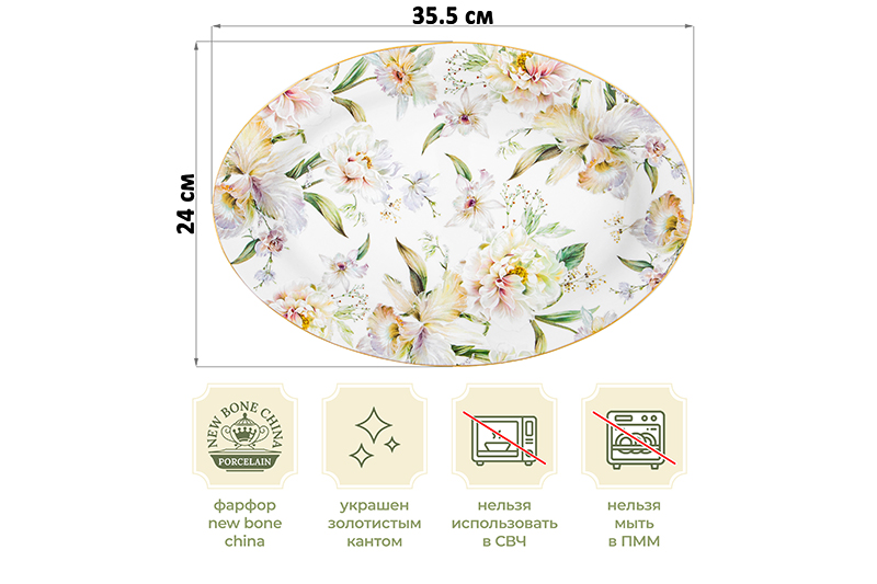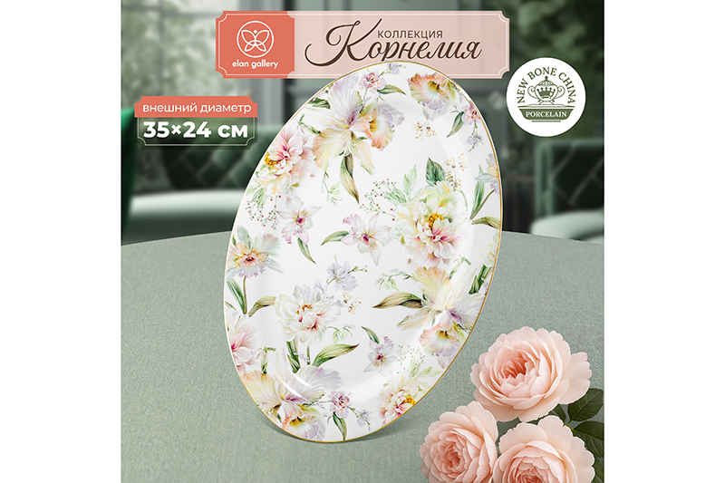 Овальное блюдо из серии "Корнелия" от Elan Gallery предназначено для эстетичной сервировки вашего стола. Размер изделия – 35,5х24х2,3 см. Выполнено из фарфора нового поколения new bone china. Материал сочетает в себе изящность и высокую прочность. За счёт гладкости изделия легко отмываются, поэтому сохраняют привлекательный внешний вид и практичны в использовании. От костяного фарфора new bone china отличается большей экологичностью в производстве. Поверхность изделия овивают обворожительные белые пионы. Они выполнены в манере, вдохновлённой акварельным рисунком. Тонкая золотистая окантовка служит деликатным акцентом и подчёркивает их изысканность. Тарелка подойдёт для подачи рыбных и мясных блюд, а также разнообразных закусок. Благодаря её вместительности можно красиво подать целую курицу, рыбу и любое мясо. Используйте для сервирования сырной нарезки, овощей и фруктов, чтобы угостить большое количество гостей. На сервировочных блюдах удобно разместить кусочки торта или пирога, конфеты, зефир, а также другие десерты и сладости. Подойдёт для красивой подачи суши, роллов и бутербродов на завтрак. Не рекомендуется применять абразивные моющие средства. Нельзя использовать в посудомоечной машине и микроволновой печи. Поставляется в дизайнерской картонной коробке – благодаря ей вам не потребуется дополнительная подарочная упаковка. Фарфоровая сервировочная посуда станет приятным подарком для тех, кто ценит сочетание практичности и привлекательности. Серия "Корнелия" от бренда Элан Галерея добавит вашему кухонному инвентарю лёгкости и элегантности, преобразив любую сервировку!