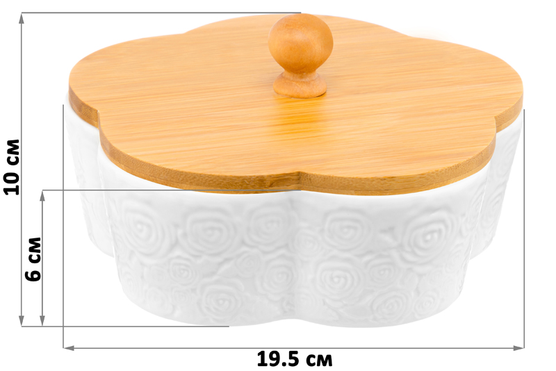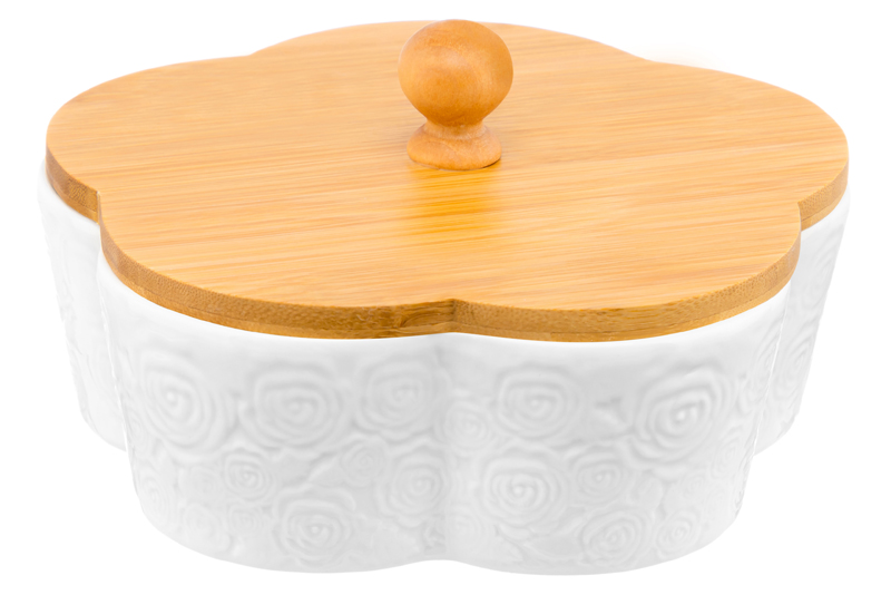Банка для печенья из серии «Розы» от Elan Gallery предназначена для эстетичной сервировки вашего стола. Размер изделия – 19,5х19,5х10 см, объём – 900 мл. Выполнена из высококачественного белого фарфора. Он не впитывает цвет продуктов и легко отмывается, благодаря чему надолго сохраняет свою белизну. Поверхность изделия украшают рельефные узоры в виде пышных бутонов роз. Красивая ёмкость в форме цветка станет не только функциональным, но и эстетичным дополнением вашего кухонного инвентаря. Наполните баночку любимым печеньем: бисквитным, сахарным или творожным. Послужит в качестве конфетницы – сложите в неё конфеты, шоколад, маленькие пирожные, пряники или любые другие сладости и выпечку. Наполните десертную вазочку большой порцией мороженного или разными десертами, чтобы разделить угощение с семьёй или друзьями. Используйте для подачи закусок: ягод, орехов, кусочков сыра или фруктов. Заполните дольками лимона, чтобы добавлять их в чай. Подойдёт для хранения сыпучих продуктов: кофе, сахара и соли, специй и приправ. Компактный контейнер удобно хранить в шкафчиках и на полках. Крышка сервировочной баночки имеет свободную посадку, чтобы её было легко и быстро открывать. Стильный и лаконичный дизайн впишет изделие в интерьер любой кухни, столовой или гостиной. Не рекомендуется применять абразивные моющие средства. Без бамбуковой крышки подходит для использования в посудомоечной машине и микроволновой печи. Бамбук нельзя замачивать! Поставляется в дизайнерской картонной коробке – благодаря ей вам не потребуется дополнительная подарочная упаковка. Фарфоровая сервировочная посуда будет оригинальным подарком для хозяйки, ценящей не только практичность, но и привлекательность. Серия «Розы» от бренда Элан Галерея станет украшением любого кухонного инвентаря и позволит собрать красивый сервиз в едином стиле!