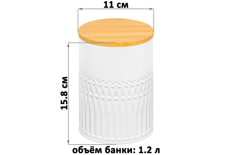 Набор 2 банок для сыпучих продуктов с бамбуковыми крышками от бренда Elan Gallery по 1,2 литра (каждая) станет удобным и эстетичным дополнением вашей кухни. Размер каждого изделия – 11х11х15,8 см, высота каждой банки без крышки – 15 см. Круглые ёмкости белого цвета выполнены из металла и плотно закрываются бамбуковыми крышками благодаря силиконовому уплотнителю. Ёмкости украшены рельефными узорами, поэтому позволят красиво хранить продукты на полке или в шкафу. Помогут хранить соль, специи, приправы, а также любые сладости. Благодаря стильному дизайну подходят для эстетичного хранения на столе, а также для сервировки печенья, мармелада или конфет. Комплект двух металлических контейнеров позволит не просто хранить чай, кофе и сахар на вашей кухне, но и станет элементом её декора. Кухонные баночки для сыпучих продуктов подойдут к интерьеру в любом стиле, от скандинавского до лофт. Не рекомендуется применять абразивные моющие средства. Нельзя использовать в микроволновой печи и посудомоечной машине. Бамбук нельзя замачивать. Поставляются в стильной картонной коробке. Набор посуды из 2 предметов станет украшением кухни или приятным подарком на любой праздник. Благодаря красочной коробочке не потребуется подарочная упаковка. В коллекции бренда Элан Галерея представлено много кухонных органайзеров, сахарниц, столового инвентаря и других стильных товаров для дома. Выберите вариант на свой вкус.