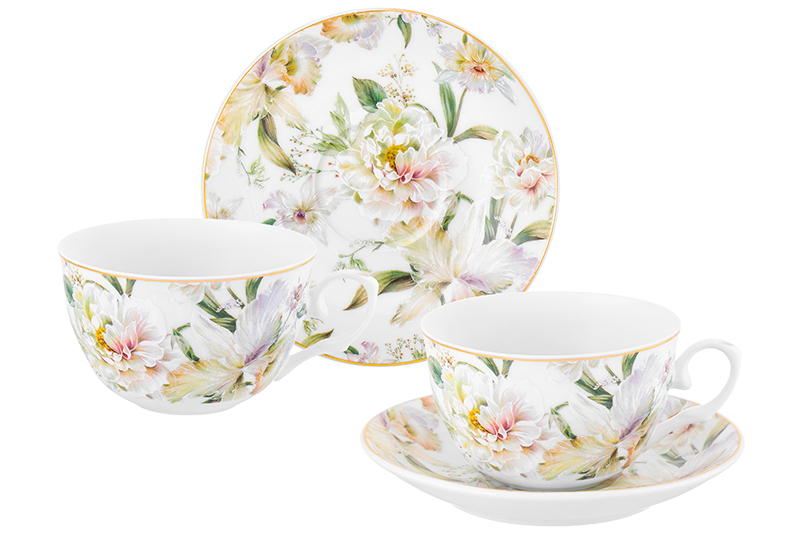 Набор 2 чайных пар из серии «Корнелия» от Elan Gallery предназначен для эстетичной сервировки вашего стола. Размер каждой ёмкости – 12,5х9,5х6 см, объём – 250 мл. Размер каждого блюдца – 14х14х2,5 см. Изготовлены из высококачественного тонкого фарфора, придающего им неповторимую лёгкость. Поверхность изделий овивают изображения обворожительных белых пионов. Они выполнены в манере, вдохновлённой акварельным рисунком. Тонкая золотистая окантовка служит деликатным акцентом и подчёркивает их изысканность. Кофейные кружечки помогут провести множество приятных завтраков с капучино и латте, а также уютные чайные вечера с конфетами, вафлями, другими десертами и сладостями. Подойдут ценителям чая и кофе, которые любят пить из красивой и необычной посуды. Согрейтесь зимой любимым напитком: какао с маршмэллоу, ягодным чаем или горячим шоколадом. Летом освежитесь домашним лимонадом или морсом. Используйте сервировочные блюдца как подставки для чашек или заполните пирожными, кусочками торта и домашнего пирога. Подойдут для закусок: сырной нарезки, сырокопчёной колбасы или свежих овощей и зелени. Декоративный комплект позволит организовать запоминающееся чаепитие в большой компании. Не рекомендуется применять абразивные моющие средства. Не подходят для использования в посудомоечной машине и микроволновой печи. Поставляются в подарочной упаковке. Фарфоровая сервировочная посуда будет оригинальным подарком для хозяйки, ценящей не только практичность, но и привлекательность. Серия «Корнелия» от бренда Элан Галерея добавит вашему кухонному инвентарю лёгкости и элегантности, преобразив любую сервировку!