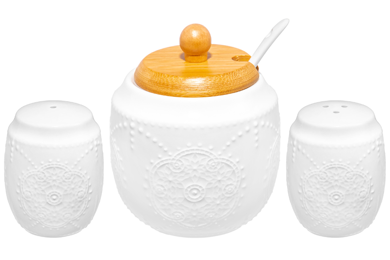 Набор посуды на бамбуковой подставке из серии «Жемчуг» от бренда Elan Gallery предназначен для эстетичной сервировки вашего стола. Включает сахарницу с ложкой, набор для специй и встроенную салфетницу. Комплект станет воплощением прекрасного вкуса. Размер подставки – 19х12,5х14 см. По центру она оснащена ручкой в виде металлической оси с круглым декоративным элементом. Выполнена из натурального бамбука. Посуда выполнена из высококачественного белого фарфора. Он не впитывает цвет продуктов и легко отмывается, благодаря чему надолго сохраняет свою белизну. Поверхность изделия украшают рельефные узоры, напоминающие тонкое кружево. Размер сахарницы – 9х9х11 см, объём – 350 мл. Подойдёт для сахара, соли и других сыпучих продуктов. Подайте её вместе с горячими блюдами, чтобы каждый мог приправить пищу по своему вкусу. Приспособьте под варенье, мёд или икру. Ложечка позволит удобно набрать необходимое количество продуктов и компактно помещается в баночке благодаря выемке на бамбуковой крышке. Набор для специй позволит держать под рукой необходимые приправы. Размер каждой ёмкости – 5х5х6,7 см, объём – 75 мл. Наполняются через отверстие снизу и закрываются пластиковой пробкой. Салфетница послужит для компактного хранения салфеток и бумажных полотенец. Не рекомендуется применять абразивные моющие средства. Фарфоровые ёмкости подходят для использования в посудомоечной машине и микроволновой печи. Бамбуковые и металлические элементы нельзя замачивать. Поставляются в дизайнерской картонной коробке – благодаря ей вам не потребуется дополнительная подарочная упаковка. Фарфоровая сервировочная посуда будет оригинальным подарком для тех, кто ценит сочетание практичности и привлекательности. Серия «Жемчуг» от бренда Элан Галерея станет украшением любого кухонного инвентаря и позволит собрать красивый сервиз в едином стиле!