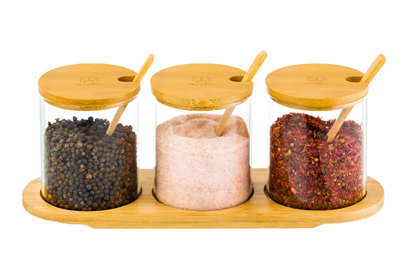 БЫЛО 1374 руб! Набор 3 банок д/специй 350 мл 29*9,5*10,5 см "Crystal glass" + бамб.крышка+ложка+бамб.подставка