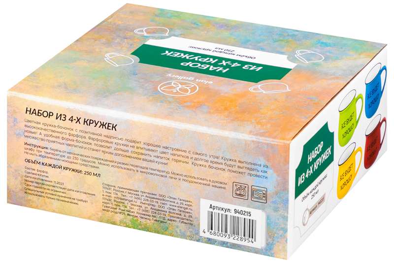 Набор из четырёх кружек Elan Gallery "Все будет хорошо!" выполнен из качественного фарфора new bone china. В комплект входят 4 кружки в форме бочонка разных цветов: салатового, синего, жёлтого и красного. Размер каждой кружечки — 11х8х7 см, объём — 250 мл. Они помогут провести множество приятных завтраков с капучино или латте, а также уютных чайных вечеров на вашей кухне. Кружки украшены мотивирующими цитатами и подходят ценителям чая и кофе, которые любят пить из красивой и необычной посуды. Можно использовать как детские для сока или молока. Кружки с позитивными надписями — это идеальный вариант для того, чтобы согреться горячим напитком зимой и освежиться прохладным лимонадом летом. Интересные кружки с удобной ручкой украсят ваш стол своим оригинальным дизайном как на праздник, так и в будни. Фарфоровые чашки отличаются от керамических повышенной плотностью. Они не впитывают цвет кофе, чая, глинтвейна, других горячих напитков и не деформируются от влаги, чему может быть подвержена керамика. Кофейные кружки с принтом можно использовать в СВЧ (микроволновая печь) и ПММ (посудомоечная машина). Поставляются в картонной упаковке. Фарфоровая посуда – оригинальный вариант подарка родным или друзьям, а также коллеге по работе на любой праздник. Их можно подарить как мужчинам, так и женщинам: маме, дочке или подруге. Наслаждайтесь любимыми напитками из этих кружечек сами, либо сделайте оригинальный подарок своим близким!