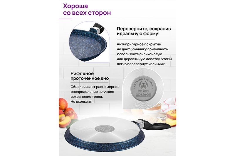 Сковорода блинная Elan Gallery "Сапфир" из серии"Гармония вкуса" диаметром 22 см равномерно разогревается и распределяет тепло таким образом, чтобы продукты сохраняли все свои полезные и вкусовые свойства. Сковорода изготовлена из литого алюминия и имеет ультрапрочное двухслойное антипригарное покрытие Cookmark. Оно защищает блинчики от пригорания и позволяет переворачивать их лопаткой без особого труда. Диаметр дна 20 см. Выполнена в стильном дизайне. Покрытие устойчиво к царапинам и износу, полностью безопасно для здоровья и не содержит PFOA или других вредных веществ. Готовьте блины идеальной формы на завтрак и радуйте ими своих близких! Эксплуатация: не нагревать без продуктов. Дайте посуде остыть, прежде чем помещать ее в воду. Использовать только деревянные и силиконовые приборы. Не мыть абразивными или щелочными моющими средствами. Использовать в посудомоечной машине только в режиме "Эко" с применением средств, не содержащих щелочи. Подходит для всех типов плит, кроме индукционных. Блинница станет идеальным подарком на любой праздник и придаст процессу приготовления пищи новый уровень комфорта. Подарите универсальную кухонную утварь своим близким. Хорошая блинная сковородка – мечта любой хозяйки! В серии "Гармония вкуса" вы найдёте любые кухонные принадлежности и инвентарь для вашего дома. Соберите набор для вашей кухни в едином стиле!