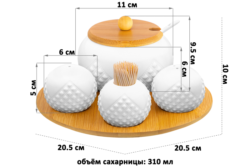 Набор посуды на деревянной подставке из серии «Ромбики» от Elan Gallery предназначен для эстетичной сервировки вашего стола. Включает в себя сахарницу с ложкой, вазочку под зубочистки и набор для специй. Выполнены из высококачественного белого фарфора. Он не впитывает цвет продуктов и легко отмывается, благодаря чему надолго сохраняет свою белизну. Поверхность украшена рельефным геометрическим узором. Подставка и крышка сахарницы выполнены из натурального бамбука. Размер подставки – 20,5х20,5х1 см. Комплект станет воплощением прекрасного вкуса. Размер сахарницы – 11х11х9,5 см, объём – 310 мл. Ёмкость подойдёт для хранения не только сахара, но и соли, специй и приправ. Засыпьте внутрь чай или кофе, чтобы в любой момент заварить свежий напиток. Подайте её вместе с горячими блюдами, чтобы каждый мог приправить пищу по своему вкусу. Эстетичную ёмкость также можно приспособить под варенье, мёд или икру. Маленькая ложечка позволит удобно набрать необходимое количество продуктов. Она компактно помещается в баночке благодаря выемке на крышке. Такое изделие отлично дополнит сервировку стола как для сытного завтрака, так и для уютного чаепития. Набор для специй позволит держать под рукой необходимые приправы. Наполняются через отверстие снизу и закрываются пластиковой пробкой. Вазочка для зубочисток станет удобной гигиенической принадлежностью. Зубочистки не входят в комплект. Размер каждого изделия – 6х6х5 см, объём – 75 мл. Не рекомендуется применять абразивные моющие средства. Без бамбуковых элементов подходят для использования в микроволновой печи и посудомоечной машине. Поставляются в дизайнерской картонной коробке – благодаря ей вам не потребуется дополнительная подарочная упаковка. Фарфоровая сервировочная посуда будет оригинальным подарком для хозяйки, ценящей не только практичность, но и привлекательность. Серия «Ромбики» от бренда Элан Галерея станет украшением любого кухонного инвентаря и позволит собрать красивый сервиз в едином стиле!