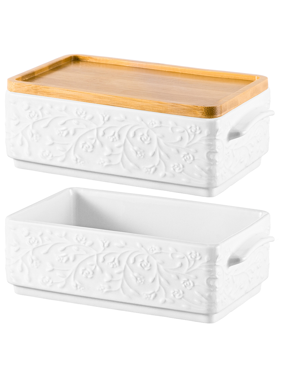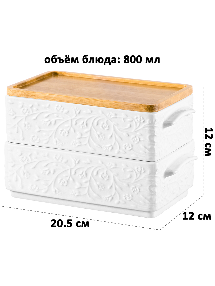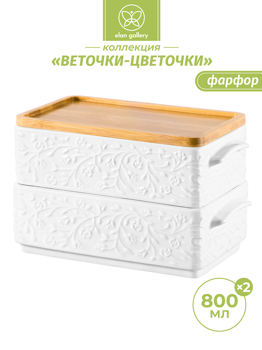 Набор 2 блюд для холодца из серии «Веточки-цветочки» от Elan Gallery предназначен для приготовления и эстетичной подачи ваших любимых блюд. Полный размер комплекта – 20,5х12х12 см, высота конструкции без крышки – 11 см. Размер каждого изделия без крышки – 20,5х11,5х6 см, объём – 800 мл, внутренний размер – 17х10,5 см. Выполнены из высококачественного фарфора. Он не впитывает цвет продуктов и легко отмывается, благодаря чему надолго сохраняет свою белизну. Поверхность изделий украшают рельефные узоры в виде лиственных веточек с аккуратными цветочными бутончиками. Крышка выполнена из натурального бамбука. Вместительные контейнеры подойдут для сельди под шубой, салатов и плова, и помогут порадовать себя или гостей за праздничным столом. Используйте их в качестве салатников или глубоких сервировочных блюд для эстетичной подачи закусок из мяса и рыбы. Такая посуда удобна для приготовления заливного или желе, а также бисквита или творожной запеканки. Заполните каждое блюдо щедрой порцией мороженого, чтобы угостить большую компанию. Компактно храните штабелируемые блюда друг на друге. Лаконичный дизайн впишет их в интерьер любой кухни, гостиной или столовой. Не рекомендуется применять абразивные моющие средства. Без крышки подойдут для использования в посудомоечной машине, микроволновой печи и духовом шкафу при температуре до 230 градусов. Бамбук нельзя замачивать! Поставляются в дизайнерской картонной коробке – благодаря ей вам не потребуется дополнительная подарочная упаковка. Фарфоровая сервировочная посуда будет оригинальным подарком для хозяйки, ценящей не только практичность, но и привлекательность. Серия «Веточки-цветочки» от бренда Элан Галерея станет украшением любого кухонного инвентаря и позволит собрать красивый сервиз в едином стиле!