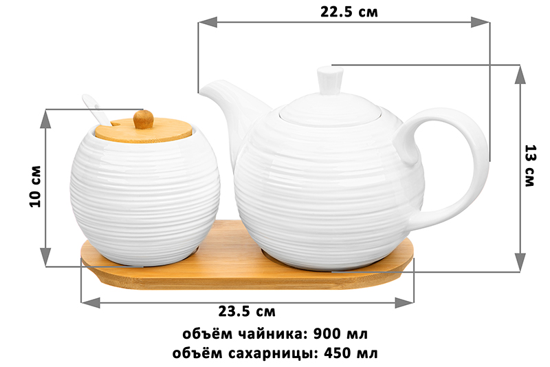 Набор Elan Gallery "Шёлк" на бамбуковой подставке выполнен из белого фарфора и украшен рельефным узором. Этот комплект станет воплощением прекрасного вкуса и поможет создать уют в вашем доме. В комплект входят: чайник заварочный объёмом 900 мл и сахарница 450 мл с бамбуковой крышкой и фарфоровой ложкой. Сахарницу можно использовать как баночку с крышкой для меда, варенья, орешков или икры. Чайник оснащен фильтром в виде маленьких отверстий в стеночке, благодаря которому вы сможете наслаждаться ароматной заваркой без попадания мелких чаинок. На фарфоровой крышке с обратной стороны есть небольшой выступ, чтобы она хорошо держалась на чайнике. Праздничный набор подходит для любителей чёрного, зелёного или травяного чая. Вы сможете удивить своих гостей красивой сервировкой стола как в будни, так и на праздник. Не рекомендуется применять абразивные моющие средства. Без бамбуковых деталей можно использовать в микроволновой печи и посудомоечной машине. Бамбук нельзя замачивать! Поставляется в стильной картонной упаковке. Подарите чайный комплект своим близким. Его красивый дизайн и функциональность оценит каждая хозяйка, а высокое качество фарфора и бамбука обеспечат долговечность этого подарка.
