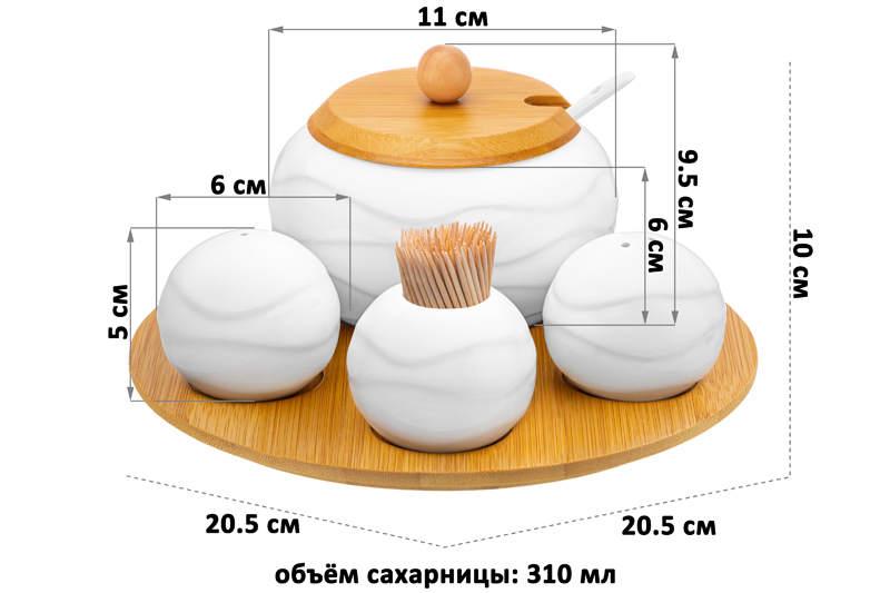 Набор серии "Айсберг волны" состоит из сахарницы на 310 мл с фарфоровой ложкой, вазочки под зубочистки, солонки и перечницы на деревянной подставке. Размер комплекта 20,5х20,5х10 см. Баночки выполнены из высококачественного фарфора и натурального бамбука. Предметы украшены рельефными узорами, что добавит изысканности вашему столу. Емкости для специй снизу имеют отверстия для наполнения, которые закрываются пластиковыми пробками. Уникальный набор посуды станет прекрасным дополнением к вашему столу и подойдет к любому интерьеру кухни, столовой или гостиной. Используйте набор для хранения сахара, соли, перца, любых специй и приправ. Каждая баночка будет выполнять свою функцию и сделает прием пищи удобным. Сахарница подойдет не только для хранения сахара, вы можете использовать ее для меда, варенья, орешков или любых сыпучих продуктов. Фарфоровые детали набора можно мыть в посудомоечной машине. Бамбуковые детали нельзя замачивать. Набор поставляется в яркой картонной упаковке. Баночки станут чудесным подарком для близких и друзей. Подарите посуду маме, бабушке, подруге, сестре, или украсьте свою кухню стильным и функциональным аксессуаром. Набор посуды серии "Айсберг волны" станет украшением вашей кухни и поможет создать на ней уют.