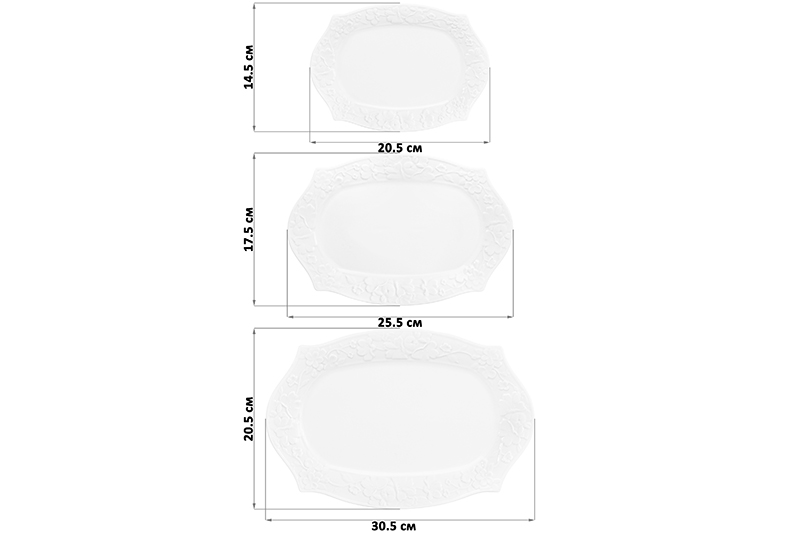 Набор 3 фигурных блюд из серии «Цветущая сакура» от Elan Gallery предназначен для эстетичной сервировки вашего стола. Включает блюда разных размеров: 30,5х20,5х2,5 см, 25,5х17,5х2 см и 20,5х14,5х2 см. Поможет отпраздновать Широкую Масленицу со вкусом! Масленица – это чудесный повод собраться за праздничным столом и насладиться тёплой атмосферой и традиционной русской кухней. В ассортименте бренда Elan Gallery вы найдёте предметы декора и красивую посуду для приготовления и сервировки масленичных блюд. Пусть Масленичная неделя принесет вам радость и множество вкусных моментов! Выполнены из высококачественного белого фарфора. Он легко отмывается и не впитывает цвет продуктов, благодаря чему надолго сохраняет свою белизну. Поверхность украшена рельефным узором в виде веточек сакуры. Сервировочный набор подойдёт для подачи самых разнообразных угощений. Разложите на большой тарелке салат, нарезку из свежих овощей и фруктов, сыры и колбасы. Средняя тарелка подойдёт для пасты, деликатесов из рыбы, а также суши и роллов. Она идеально послужит для подачи вторых блюд. Маленькая тарелочка поможет вам изящно преподнести закуски – орешки, сухофрукты, ягоды и фруктовые дольки. Заполните три блюда разнообразными сладостями – от кусочков торта и пирогов до булочек и конфет. Проведите незабываемое чаепитие в приятной компании. Не рекомендуется применять абразивные моющие средства. Подходят для использования в посудомоечной машине и микроволновой печи. Поставляются в дизайнерской картонной коробке – благодаря ей вам не потребуется дополнительная подарочная упаковка. Фарфоровая сервировочная посуда станет оригинальным подарком для хозяйки, ценящей не только практичность, но и привлекательность. Серия «Цветущая сакура» от бренда Элан Галерея украсит любой кухонный инвентарь и позволит собрать красивый сервиз в едином стиле!
