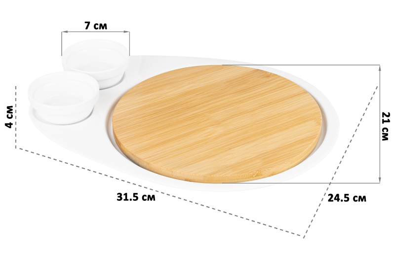 Набор для сервировки сыра из серии «Айсберг» предназначен для эстетичной подачи закусок к столу. Размер изделия – 31,5х24,5х4 см. Размер доски – 21х21х1 см. Размер каждого соусника – 7х7х3 см, объём – 50 мл. Выполнены из высококачественного белого фарфора, разделочная доска в комплекте выполнена из бамбука. Фарфор не впитывает цвет продуктов и легко отмывается, благодаря чему надолго сохранит свою белизну. Используйте соусники для подачи оливок, маслин, виноградин, фруктовых долек или нарезанных овощей. Заполните кетчупом, майонезом или жидкими соусами. Разделочная доска позволит нарезать продукты без дополнительных кухонных принадлежностей. Сервировочное блюдо поможет вам создать идеальную атмосферу для приёма гостей или романтичного ужина дома. Возьмите его на дачу или пикник, чтобы красиво подавать любимые угощения. Используйте деревянную подставку для сервировки отдельно от блюда, чтобы подать ещё больше лакомств! Не рекомендуется применять абразивные моющие средства. Без бамбуковой подставки подходит для использования в микроволновой печи и посудомоечной машине. Бамбук нельзя замачивать! Фарфоровая сервировочная посуда с элементами из дерева станет оригинальным подарком для хозяйки, ценящей не только практичность, но и привлекательность. Серия «Айсберг» станет украшением любого кухонного инвентаря и позволит собрать красивый сервиз в едином стиле!