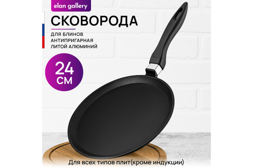 Сковорода блинная Elan Gallery "Гармония вкуса" в оттенке "Чёрный оникс" диаметром 24 см равномерно разогревается и распределяет тепло таким образом, чтобы продукты сохраняли все свои полезные и вкусовые свойства. Сковорода изготовлена из литого алюминия и имеет ультрапрочное двухслойное антипригарное покрытие Cookmark. Оно защищает блинчики от пригорания и позволяет переворачивать их лопаткой без особого труда. Выполнена в стильном дизайне. Покрытие устойчиво к царапинам и износу, полностью безопасно для здоровья и не содержит PFOA или других вредных веществ. Готовьте блины идеальной формы на завтрак и радуйте ими своих близких! Эксплуатация: не нагревать без продуктов. Дайте посуде остыть, прежде чем помещать ее в воду. Использовать только деревянные и силиконовые приборы. Не мыть абразивными или щелочными моющими средствами. Использовать в посудомоечной машине только в режиме "Эко" с применением средств, не содержащих щелочи. Подходит для всех типов плит, кроме индукционных. Блинница станет идеальным подарком для женщин и придаст процессу приготовления пищи новый уровень комфорта. Подарите универсальную кухонную утварь вещь маме, подруге, сестре или тёте. Хорошая блинная сковородка – мечта любой хозяйки! В серии "Гармония вкуса" вы найдёте любые кухонные принадлежности и инвентарь для вашего дома. Соберите набор для вашей кухни в едином стиле!