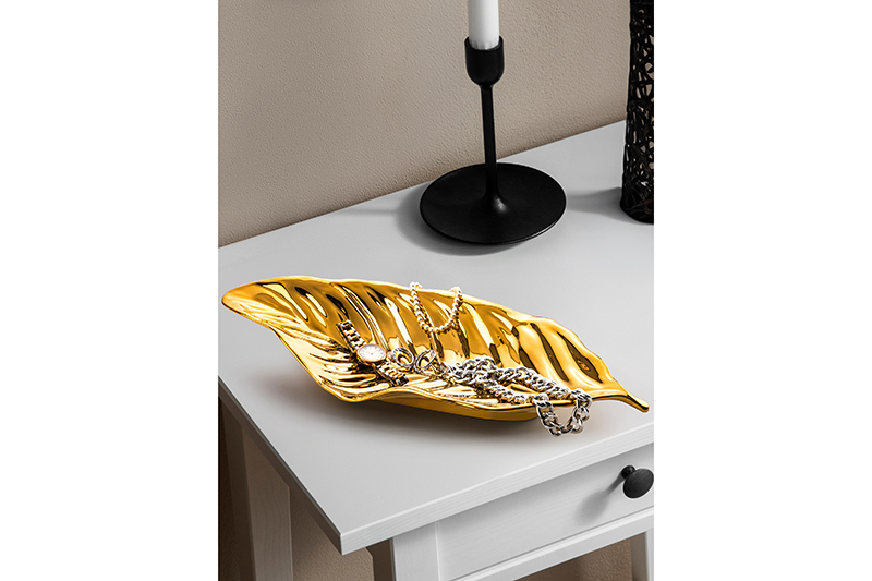 Фигурное сервировочное блюдо «Лист» предназначено для подачи разнообразных угощений и оформления декоративных композиций. Размер изделия – 44,8х17,5х7,7 см. Выполнено из качественного фарфора в форме большого детализированного листика золотого цвета. Фарфор не впитывает цвет продуктов и надолго сохранит свой изначальный вид. Декоративная фарфоровая тарелка украсит любой интерьер благодаря своему необычному дизайну и удивит даже самых привередливых гостей. Подойдёт для подачи сыра и колбасы, а также рыбных и мясных деликатесов. Красиво подайте к столу бутерброды с хлебом и сырной нарезкой. Идеально для сервировки закусок – суши, роллов и канапе, а также салатов, свежих фруктов и овощей. Наполните его десертами и сладостями: конфетами, печеньем, кусочками торта и пирога. Оригинальное блюдо послужит для украшения вашего дома в качестве декора. Поставьте его на тумбочку или полку в качестве самостоятельного декоративного элемента, сделайте частью композиции с искусственными фруктами, сухоцветами и другими предметами, чтобы украсить свой дом и привнести интерьеру изысканности. Не рекомендуется применять абразивные моющие средства. Не подходит для использования в микроволновой печи. Можно использовать в посудомоечной машине. Посуда поставляется в красивой картонной коробке – благодаря ей вам не потребуется дополнительная подарочная упаковка. Это приятный подарок на праздник для хозяйки, ценящей не только практичность, но и стиль. В коллекции бренда Elan Gallery представлено много товаров для создания комфорта и уюта на вашей кухне. Тарелка добавит роскоши вашему дому и создаст праздничную атмосферу даже в будний день!