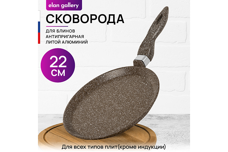 Сковорода блинная Elan Gallery "Гармония вкуса" в оттенке "Коричневый опал" диаметром 22 см равномерно разогревается и распределяет тепло таким образом, чтобы продукты сохраняли все свои полезные и вкусовые свойства. Сковорода изготовлена из литого алюминия и имеет ультрапрочное двухслойное антипригарное покрытие Cookmark. Оно защищает блинчики от пригорания и позволяет переворачивать их лопаткой без особого труда. Выполнена в стильном дизайне. Покрытие устойчиво к царапинам и износу, полностью безопасно для здоровья и не содержит PFOA или других вредных веществ. Готовьте блины идеальной формы на завтрак и радуйте ими своих близких! Эксплуатация: не нагревать без продуктов. Дайте посуде остыть, прежде чем помещать ее в воду. Использовать только деревянные и силиконовые приборы. Не мыть абразивными или щелочными моющими средствами. Использовать в посудомоечной машине только в режиме "Эко" с применением средств, не содержащих щелочи. Подходит для всех типов плит, кроме индукционных. Блинница станет идеальным подарком для женщин и придаст процессу приготовления пищи новый уровень комфорта. Подарите универсальную кухонную утварь вещь маме, подруге, сестре или тёте. Хорошая блинная сковородка – мечта любой хозяйки! В серии "Гармония вкуса" вы найдёте любые кухонные принадлежности и инвентарь для вашего дома. Соберите набор для вашей кухни в едином стиле!
