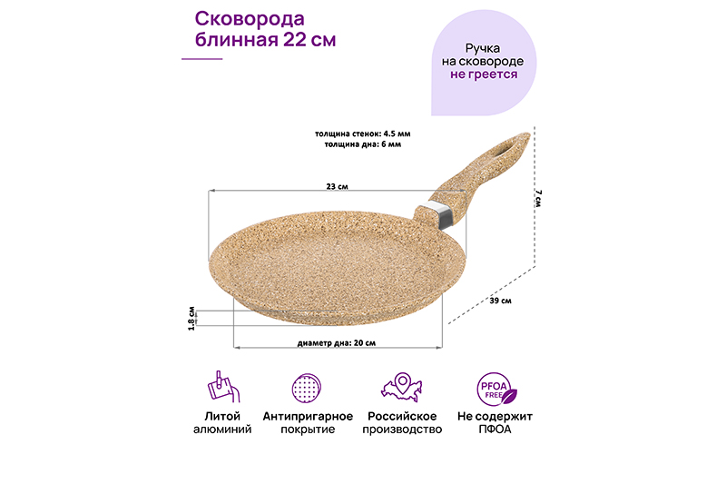 БЫЛО 1572 руб! Сковорода блинная 22 см ГАРМОНИЯ ВКУСА "Медовый гранит" н/р, 39*23*7 см