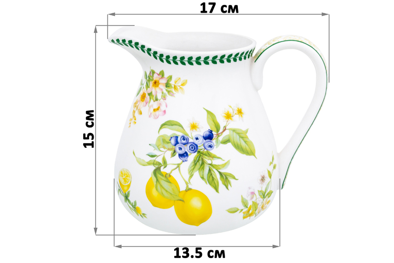 Кувшин из серии «Лимоны» предназначен для красивой сервировки стола. Размер ёмкости – 17х13,5х15 см, объём – 1,2 литра. Выполнен из фарфора нового поколения new bone china, сочетающего в себе изящность и высокую прочность. За счёт гладкости изделия легко отмываются, поэтому долго сохраняют привлекательный вид и практичны в использовании. Плотная структура материала позволяет посуде дольше сохранять температуру блюд и напитков. От других видов костяного фарфора new bone china отличается большей экологичностью в производстве. Фарфоровая посуда с ярким рисунком в виде лимонов станет изящным дополнением интерьера любой кухни или столовой. Сосуд отлично подойдёт для хранения воды и молока. Он послужит прекрасной альтернативной скучным пакетам сока и поможет в подаче компотов, коктейлей и любых других напитков. Дополнит эстетичную сервировку стола и станет незаменимым помощником на семейных и дружеских застольях. Не рекомендуется применять абразивные моющие средства. Подходит для использования в посудомоечной машине. Поставляется в красивой картонной коробке – благодаря ей вам не потребуется дополнительная подарочная упаковка. Кувшин станет оригинальным подарком для любой хозяйки и незаменимым элементом сервировочного инвентаря в вашем доме!